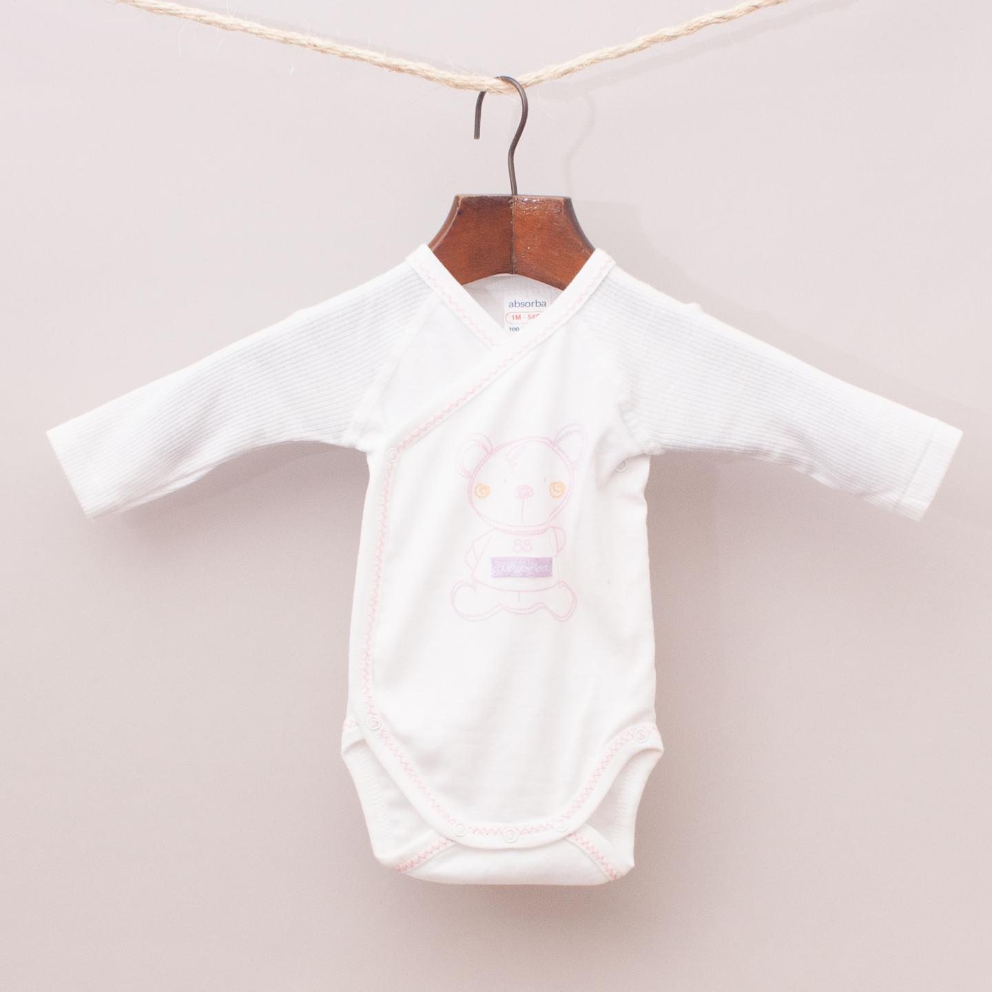Absorba "brand new with tags" white long sleeve romper with printed bear on the front and pink embroidered trim - 100% Cotton
