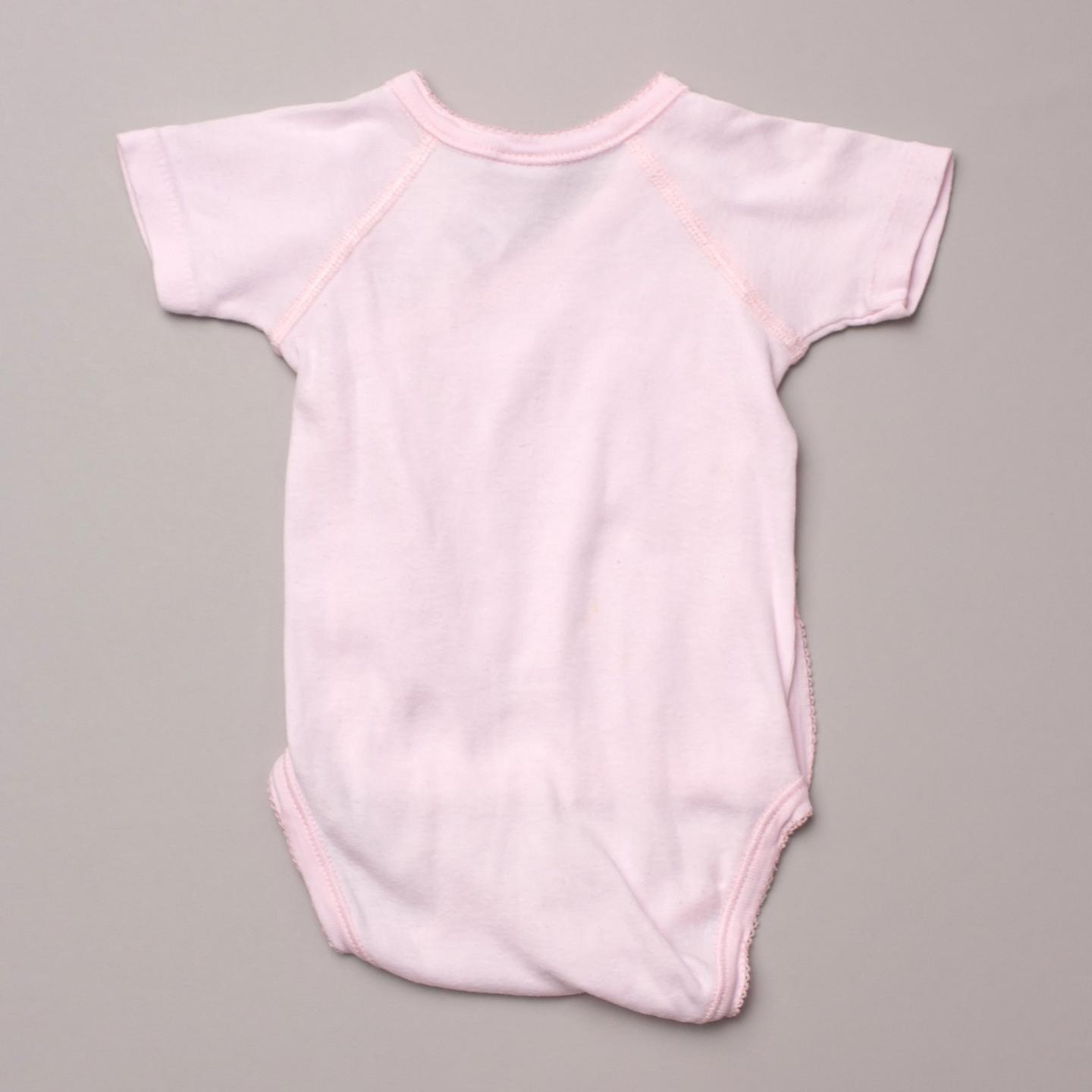 Absorba soft pink short sleeve romper with embroidery on the front and front button closures