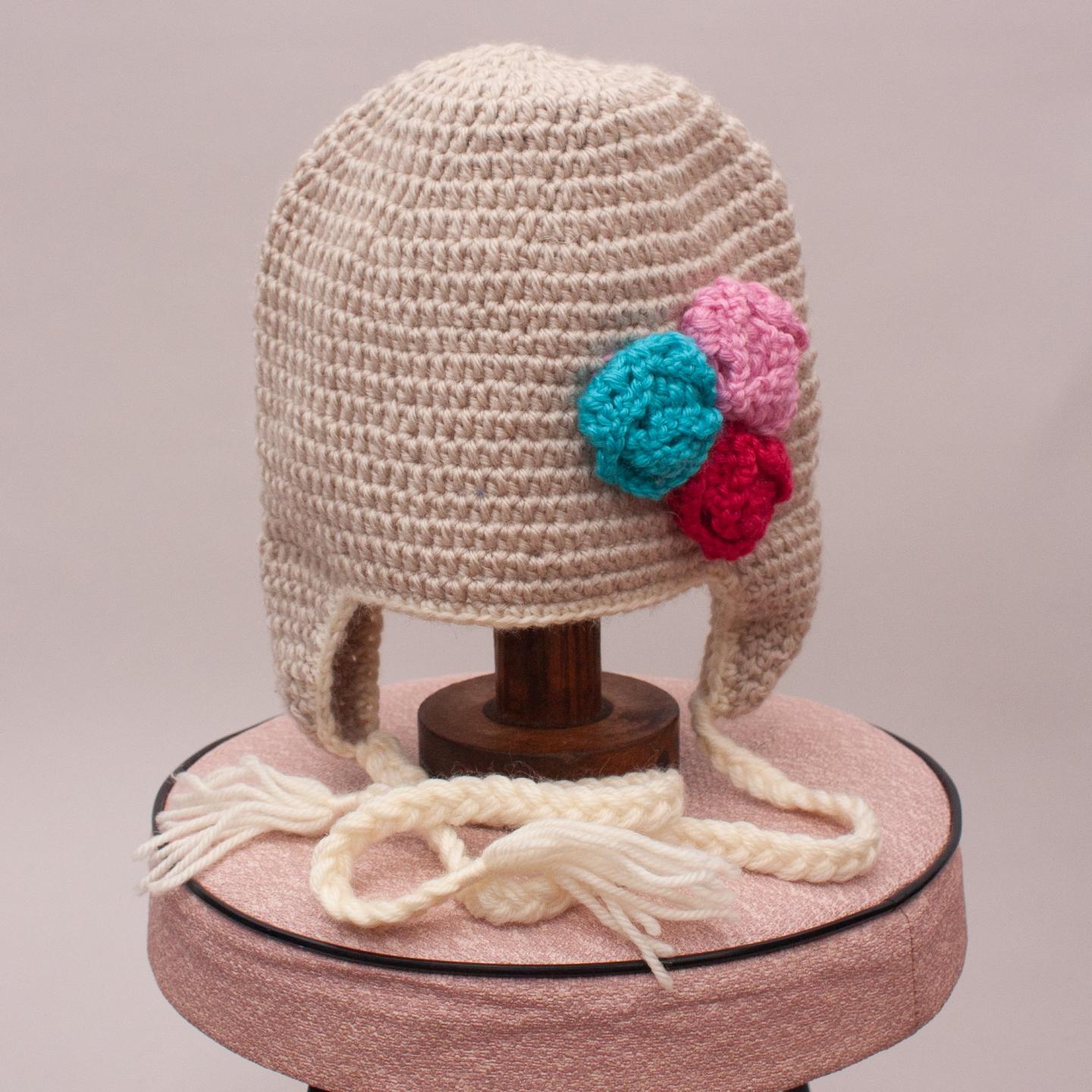 Acorn grey knit beanie with cream edging and tassels and fabric flower details