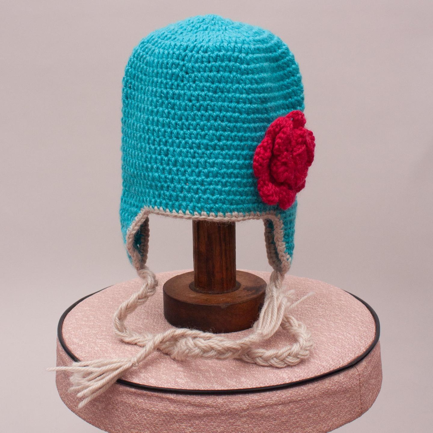 Acorn bright blue knit beanie with cream plaited trim and fabric flower