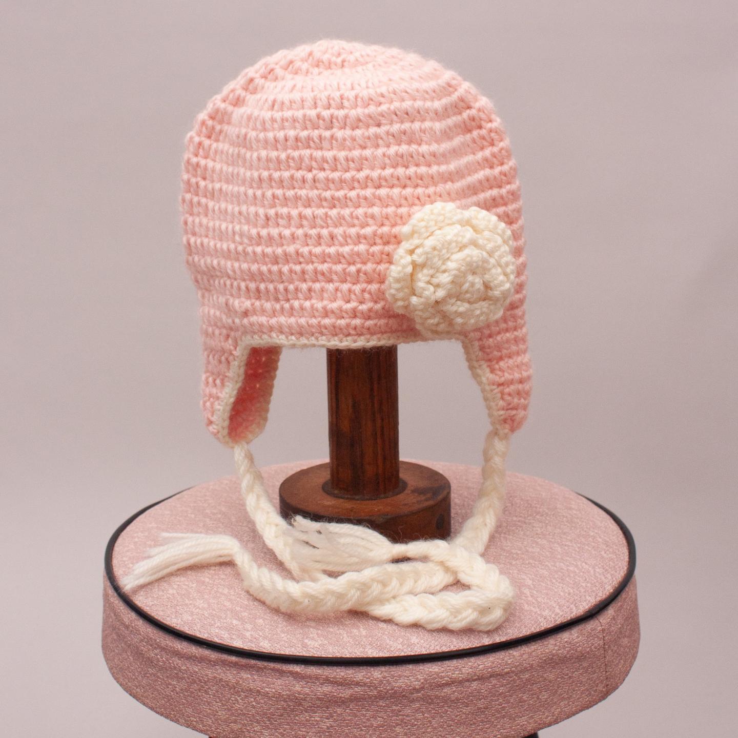 Acorn pink knit beanie with cream plaited tassels and fabric flower detail - Size XS
