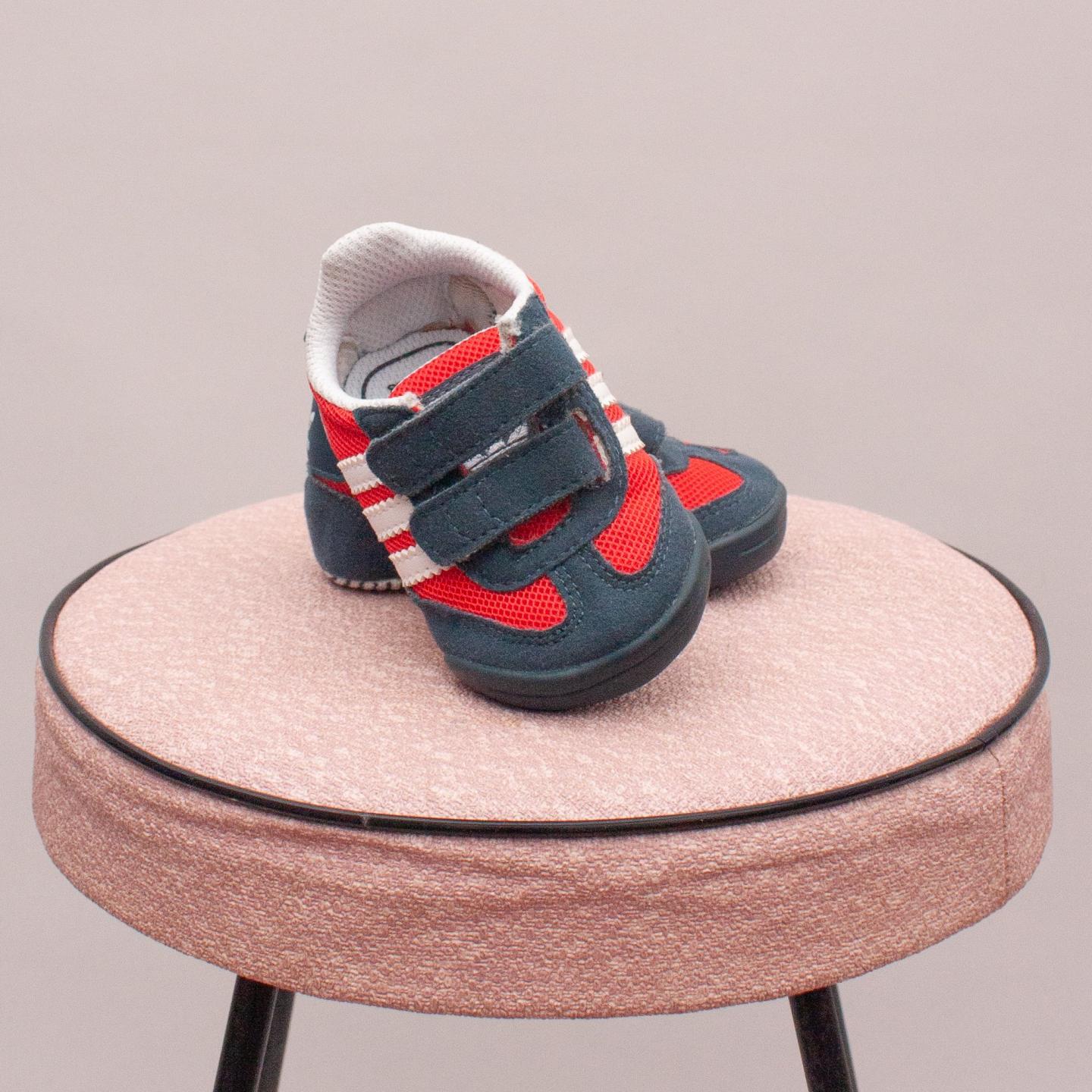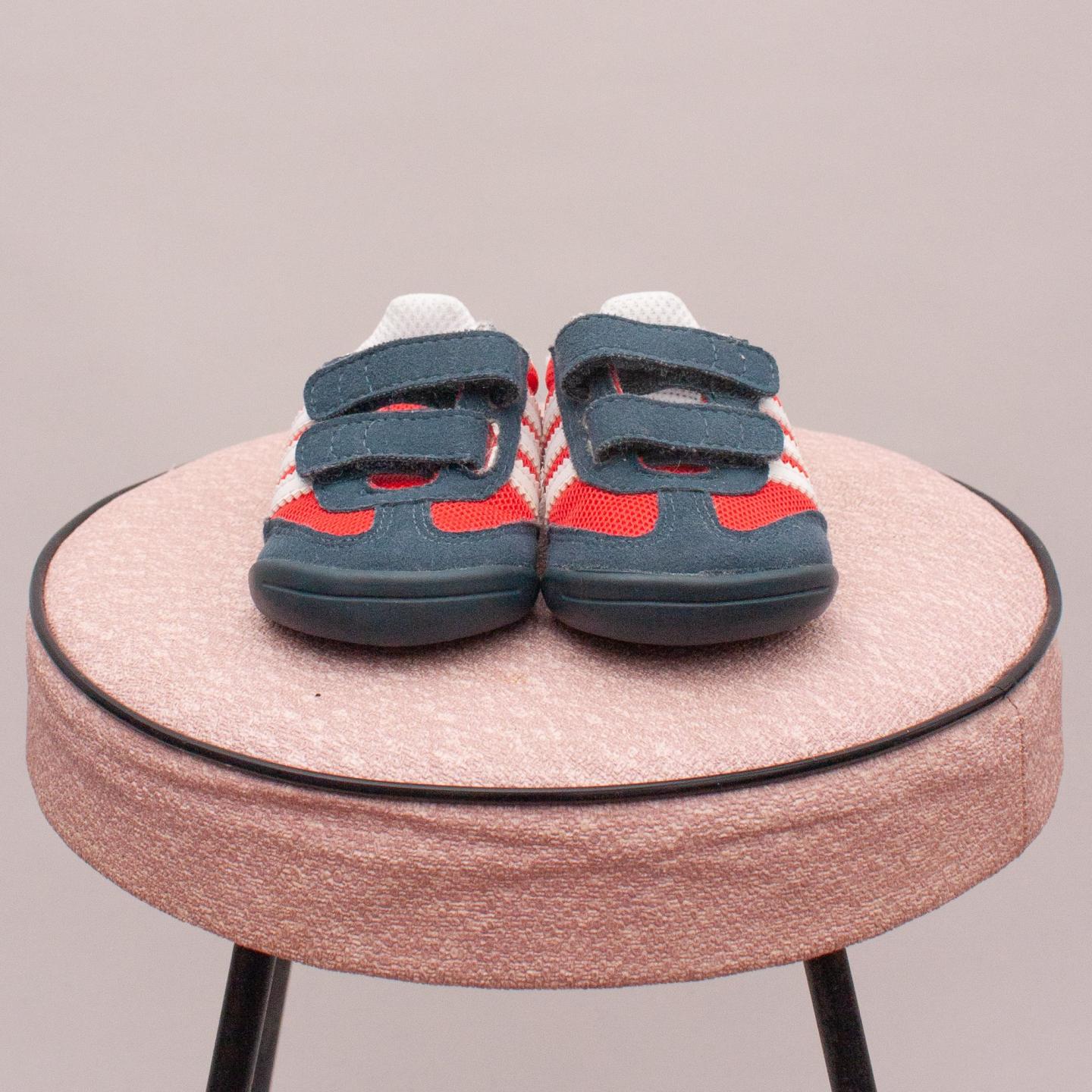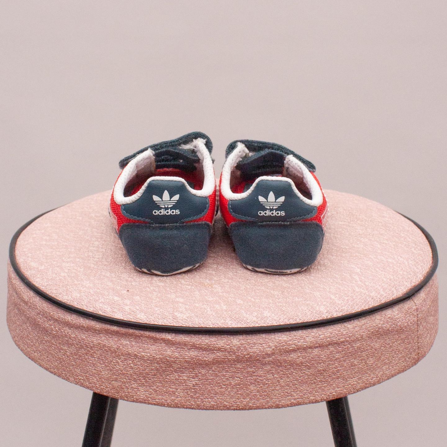 Adidas blue, red and white dragon ortholite sneakers with two velcro straps - Size UK 1 (0-12Mths Approx.)