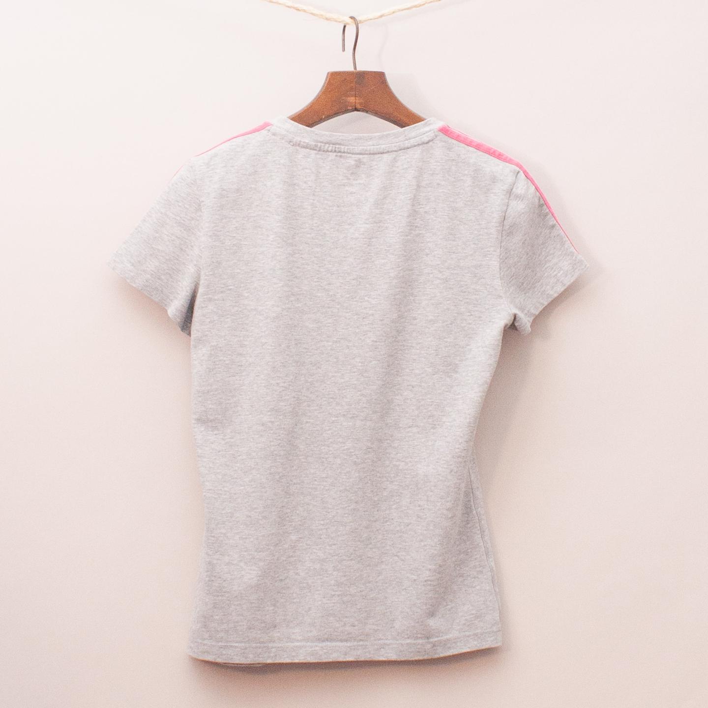 Adidas grey t-shirt with pink stripe details and pink embroidered logo on the front *68% Cotton, 27% Polyester, 5% Elastane