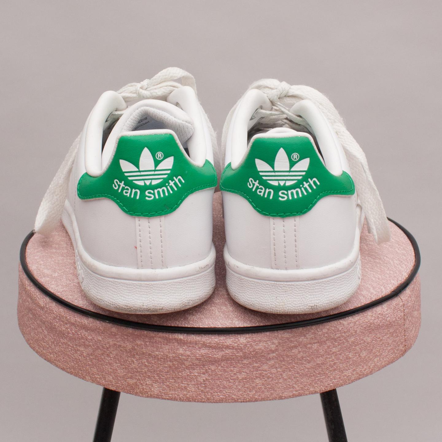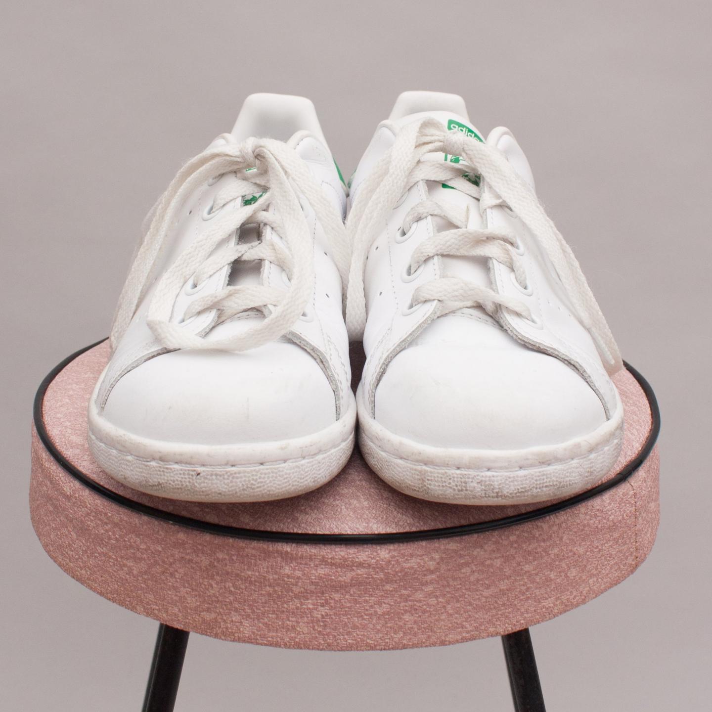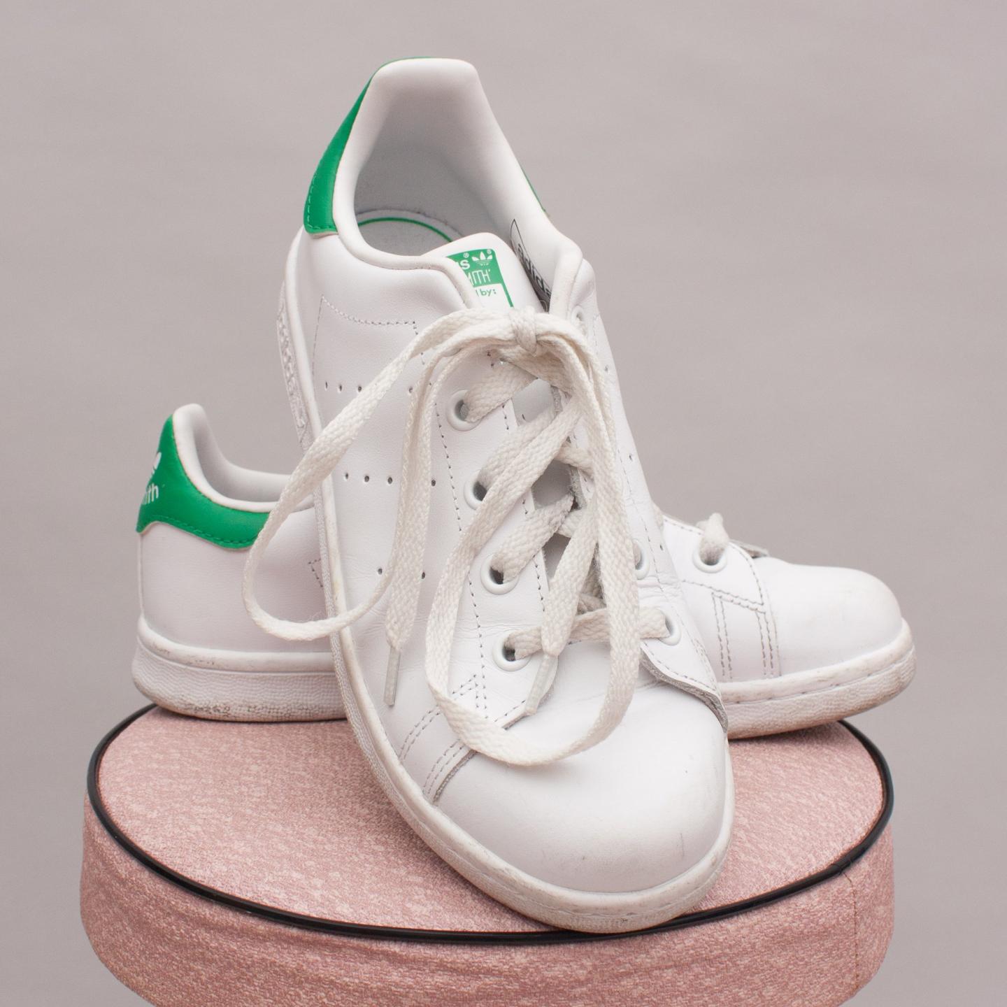 Adidas white and green leather 'Stan Smith' sneakers with white laces, adidas logo throughout and sturdy rubber soles - Size US 3 (Age 7 Approx.)