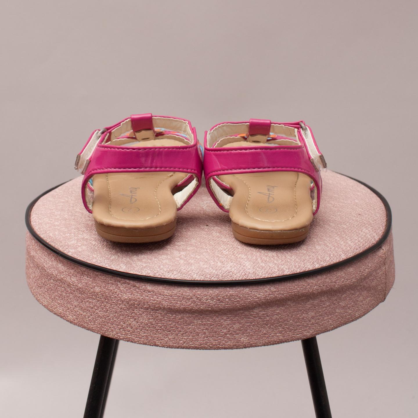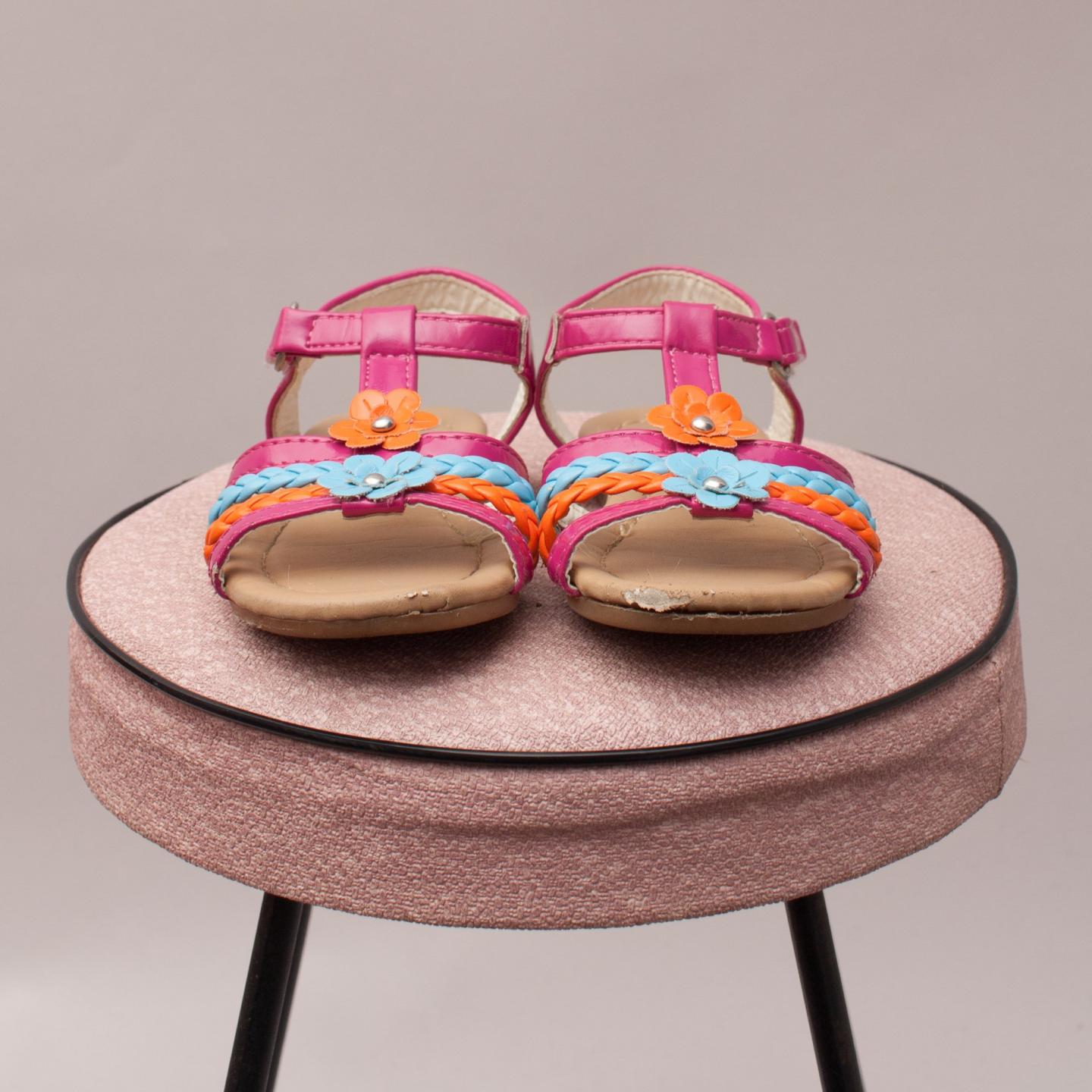 Amy patent leather hot pink, orange and blue strappy sandals with two flowers on the front and side velcro strap - Size US 7 (0-12Mths Approx.) *Slight scuffs on the toe