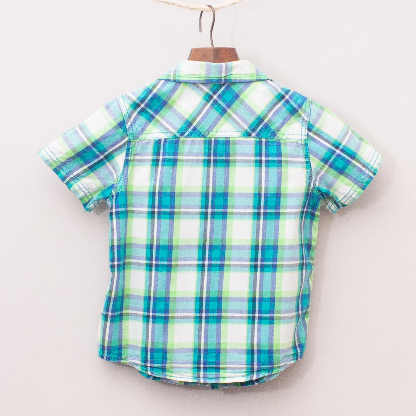 Arizona Jeans blue, green and white plaid short sleeve shirt with singe front pocket and full button down front *100% Cotton
