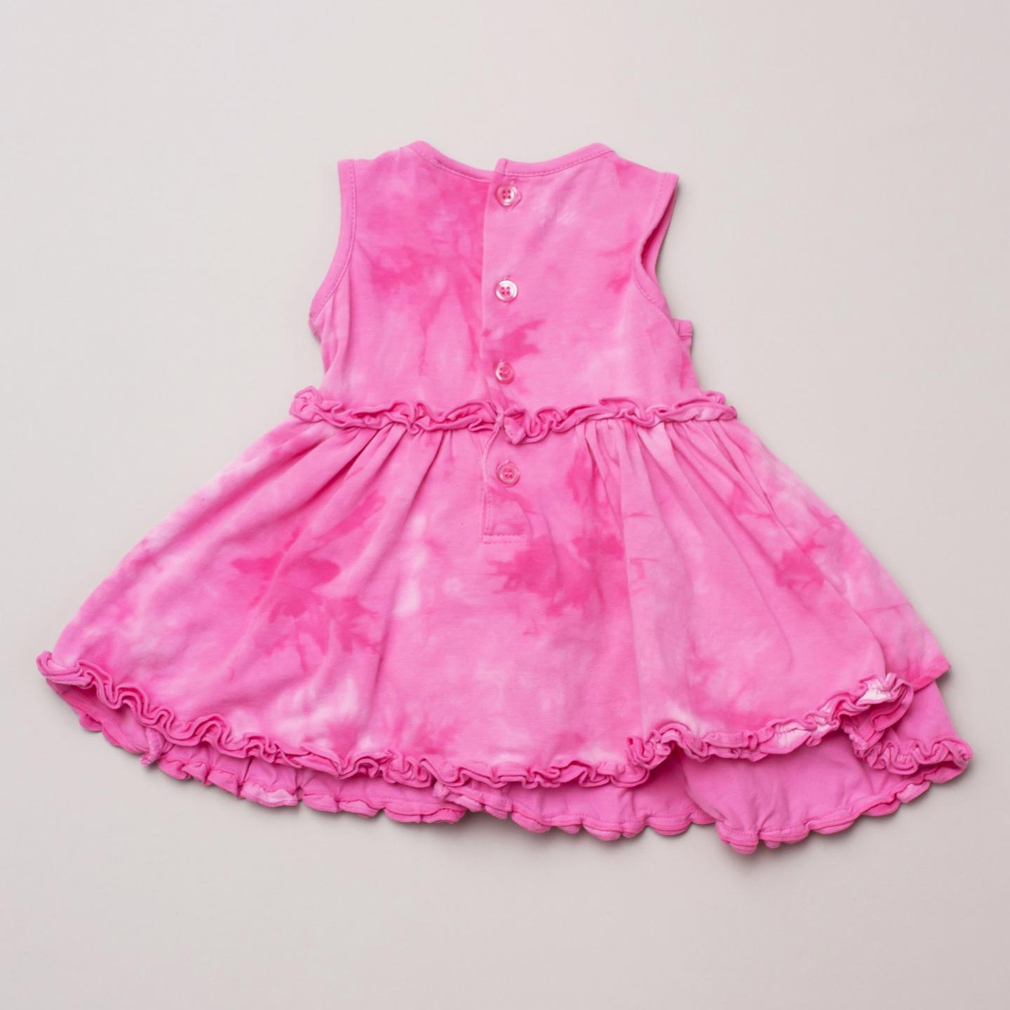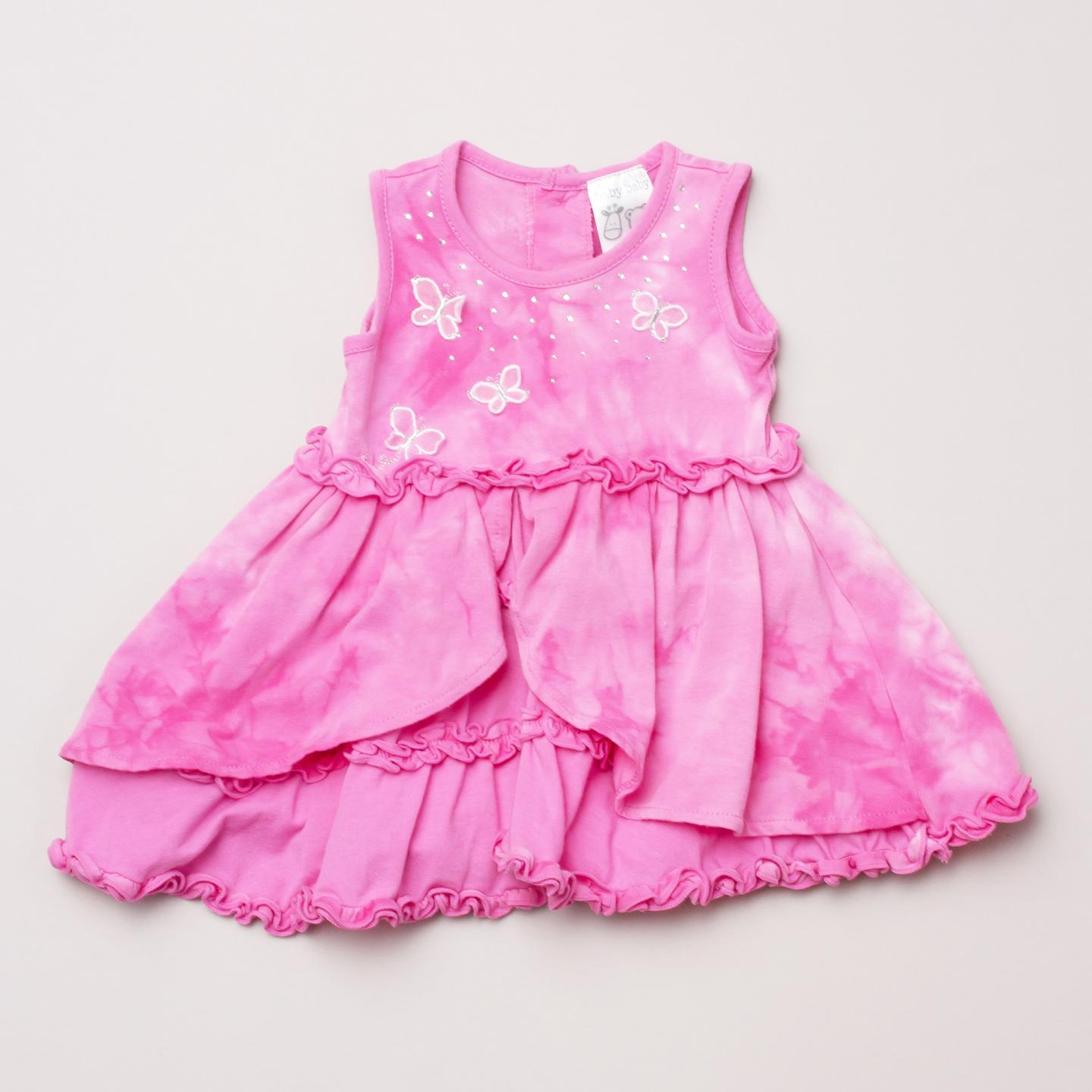 Baby Baby tie dye pink dress with layer and ruffle details, sheer, embroidered butterflies and diamante dotted on the front