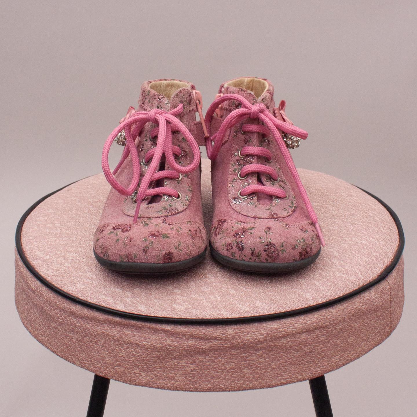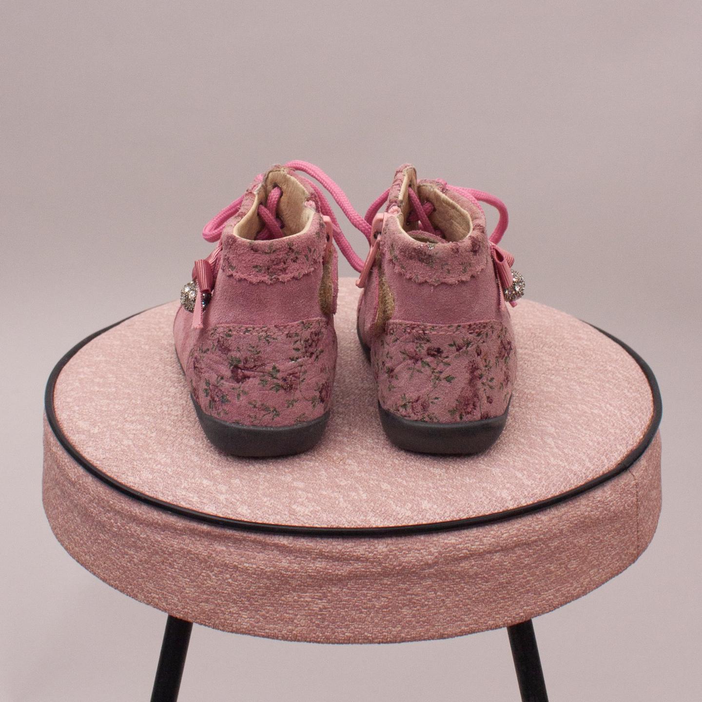Balducci pink suede lace up's with pink laces, flower pattern detail with bow and diamante ball detail and side zip fastening - Size EU 18 (00-12Mths Approx.)