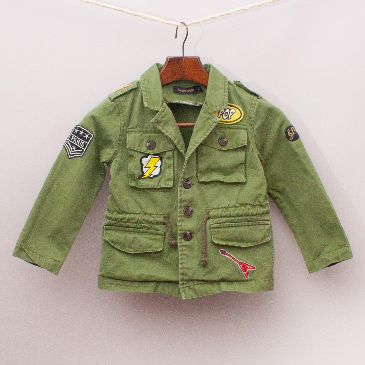 Ballon Rouge khaki military style jacket with fun embroidered patches throughout, multiple pockets and button down front with drawstring waist