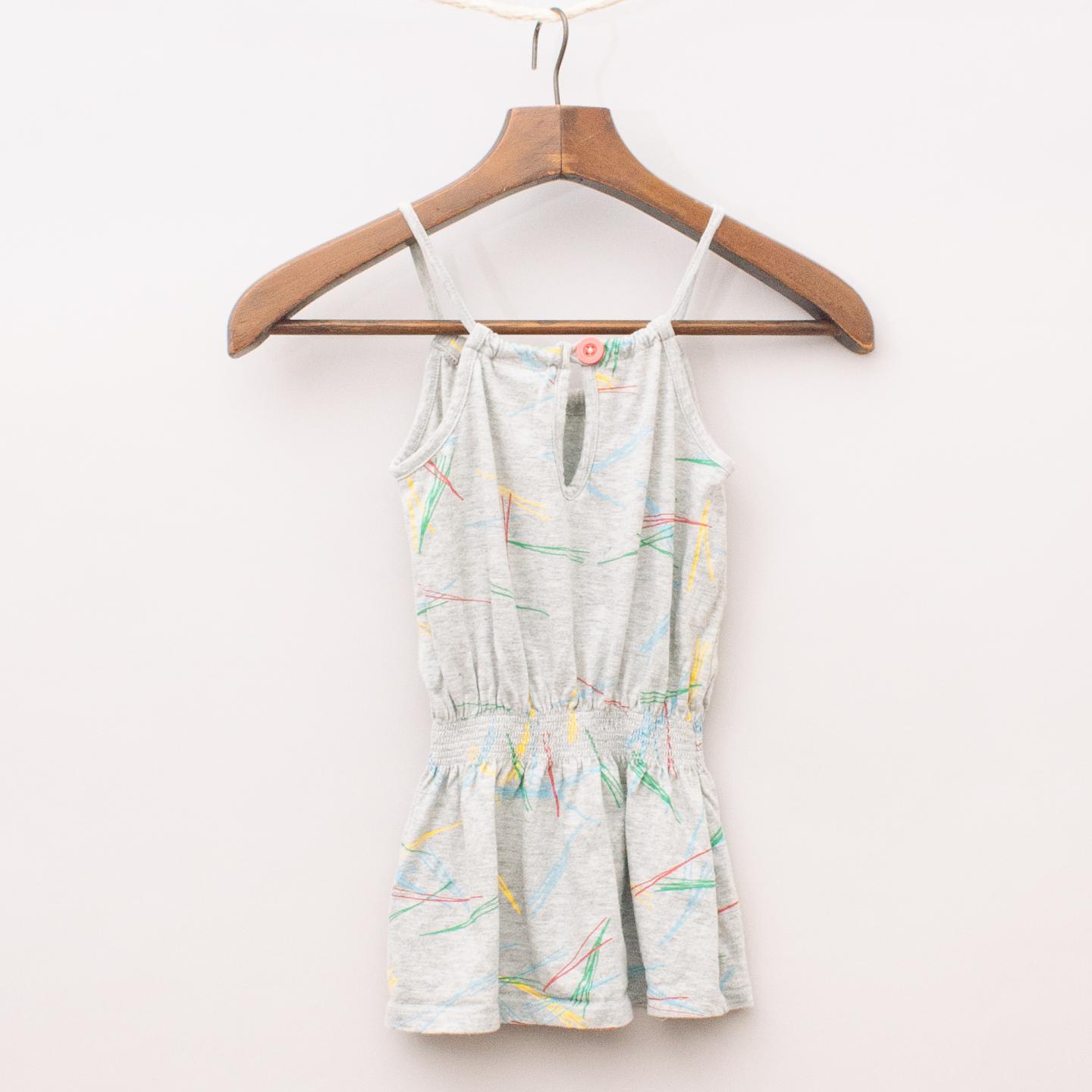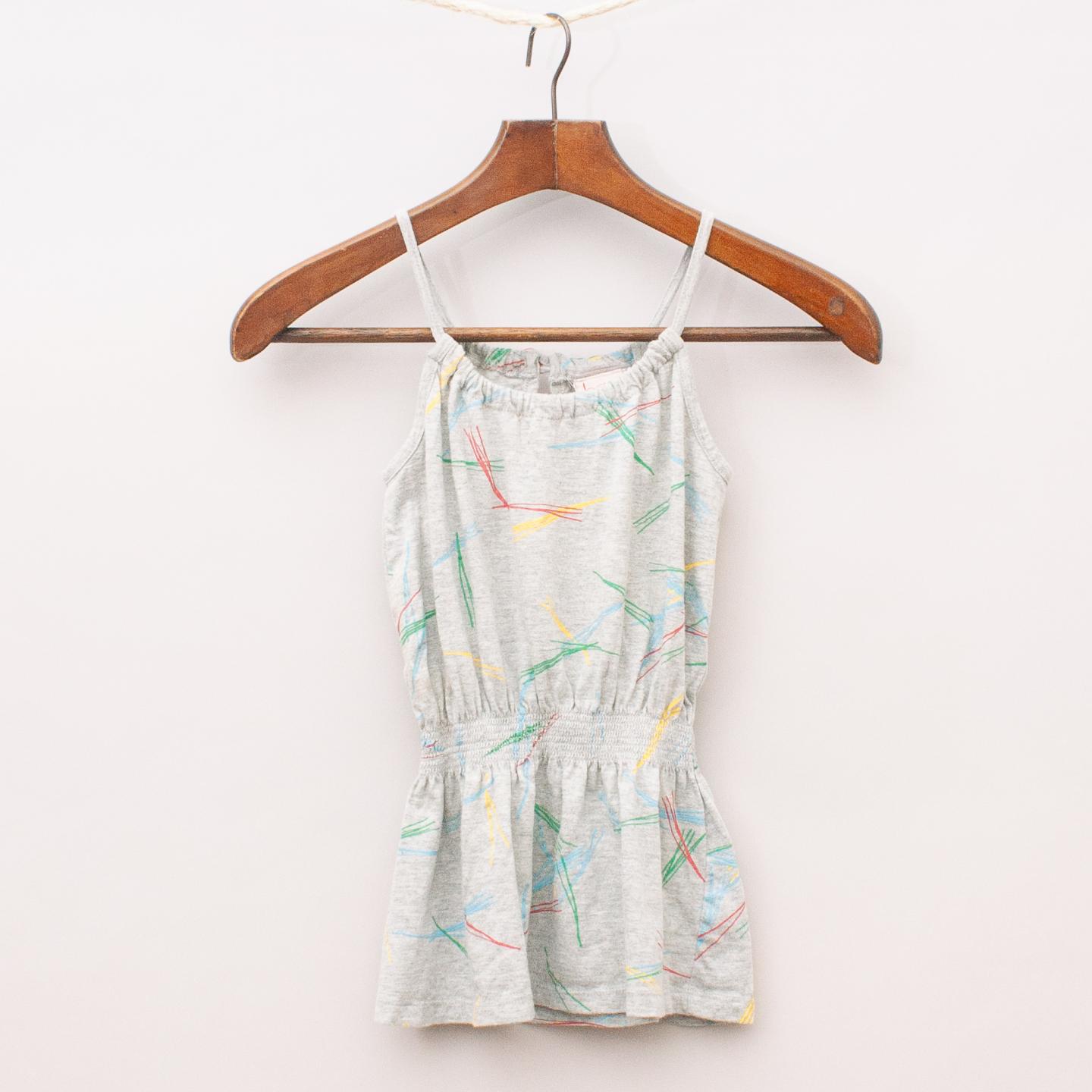 Bao Bab grey singlet top with coloured patterned throughout, adjustable neckline and elastic waist with single button back closure *100% Cotton