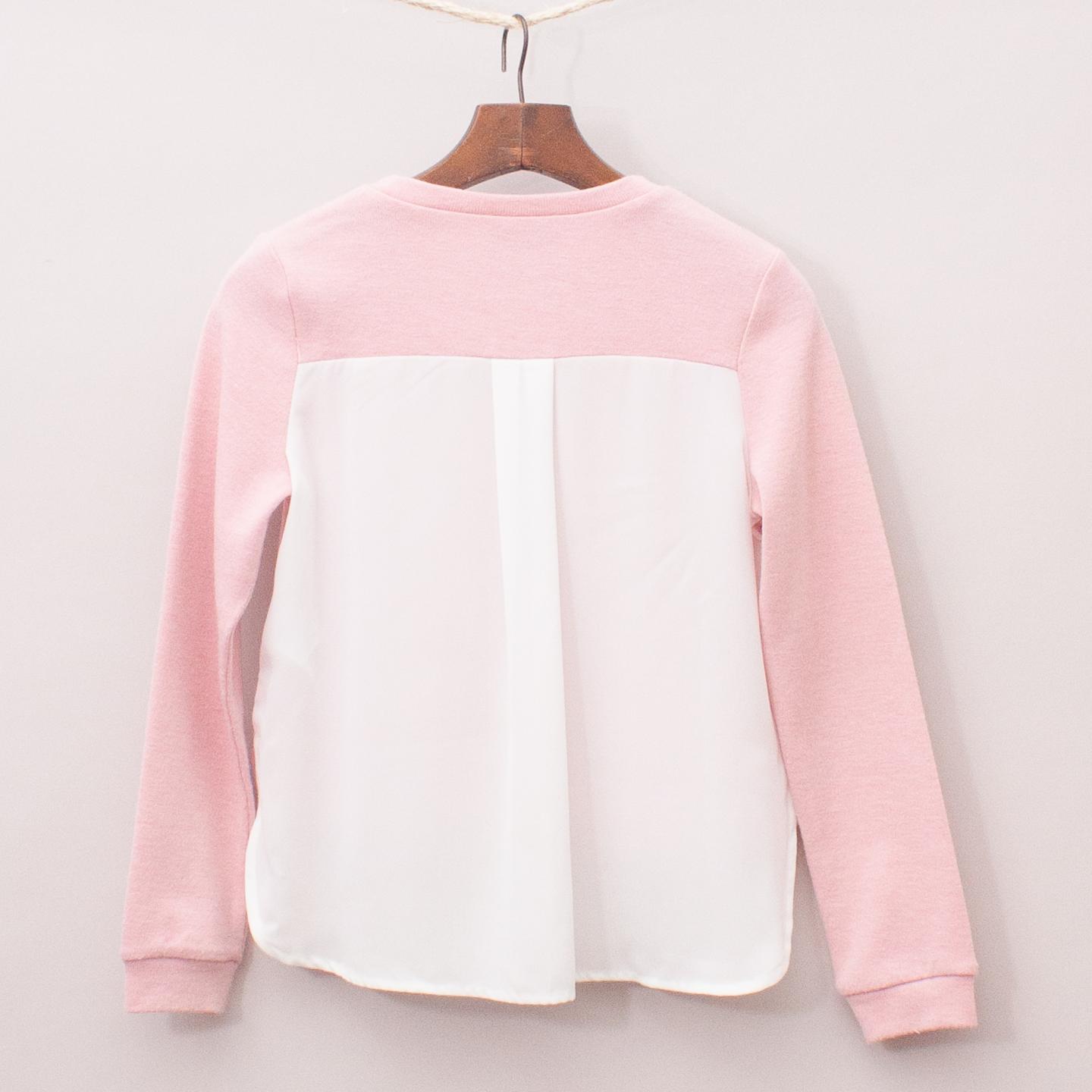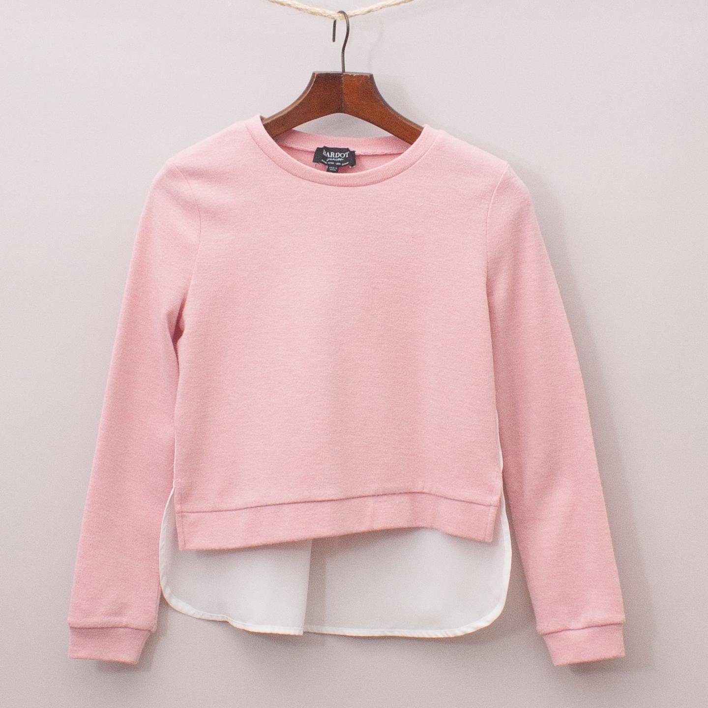 Bardot pastel pink jumper with white sheer back and high/low hemline *82% Polyester, 15% Viscose, 3% Elastane