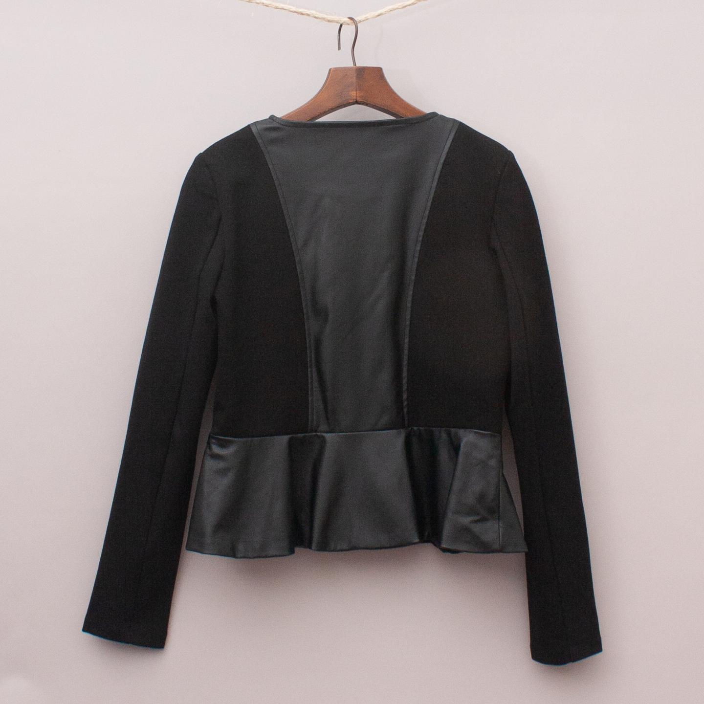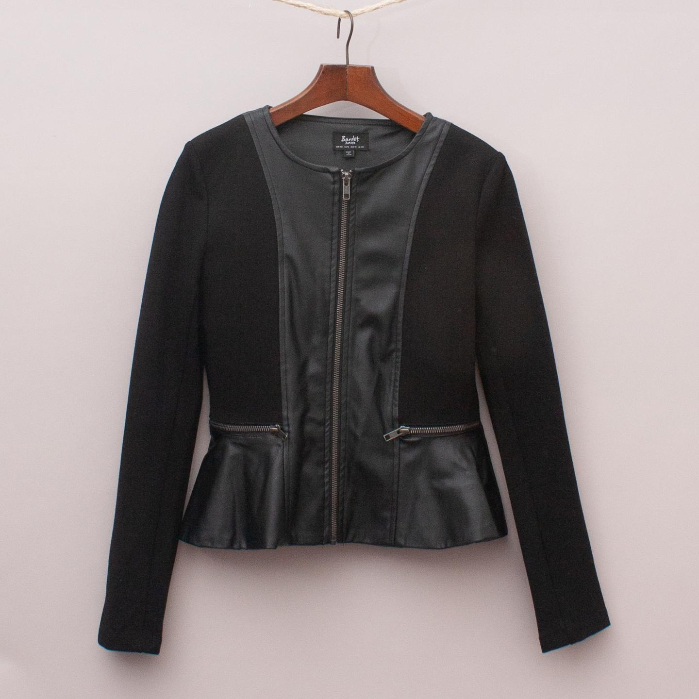 Bardot black faux leather jacket with peplum hemline, contrasting fabric panels and full zip up front *100% Polyurethane