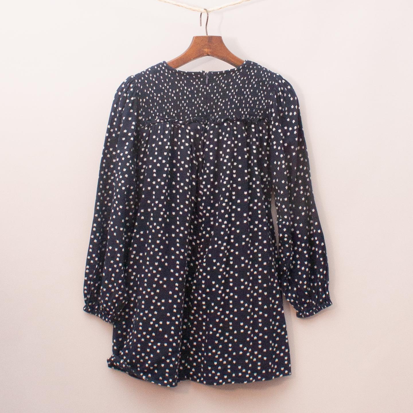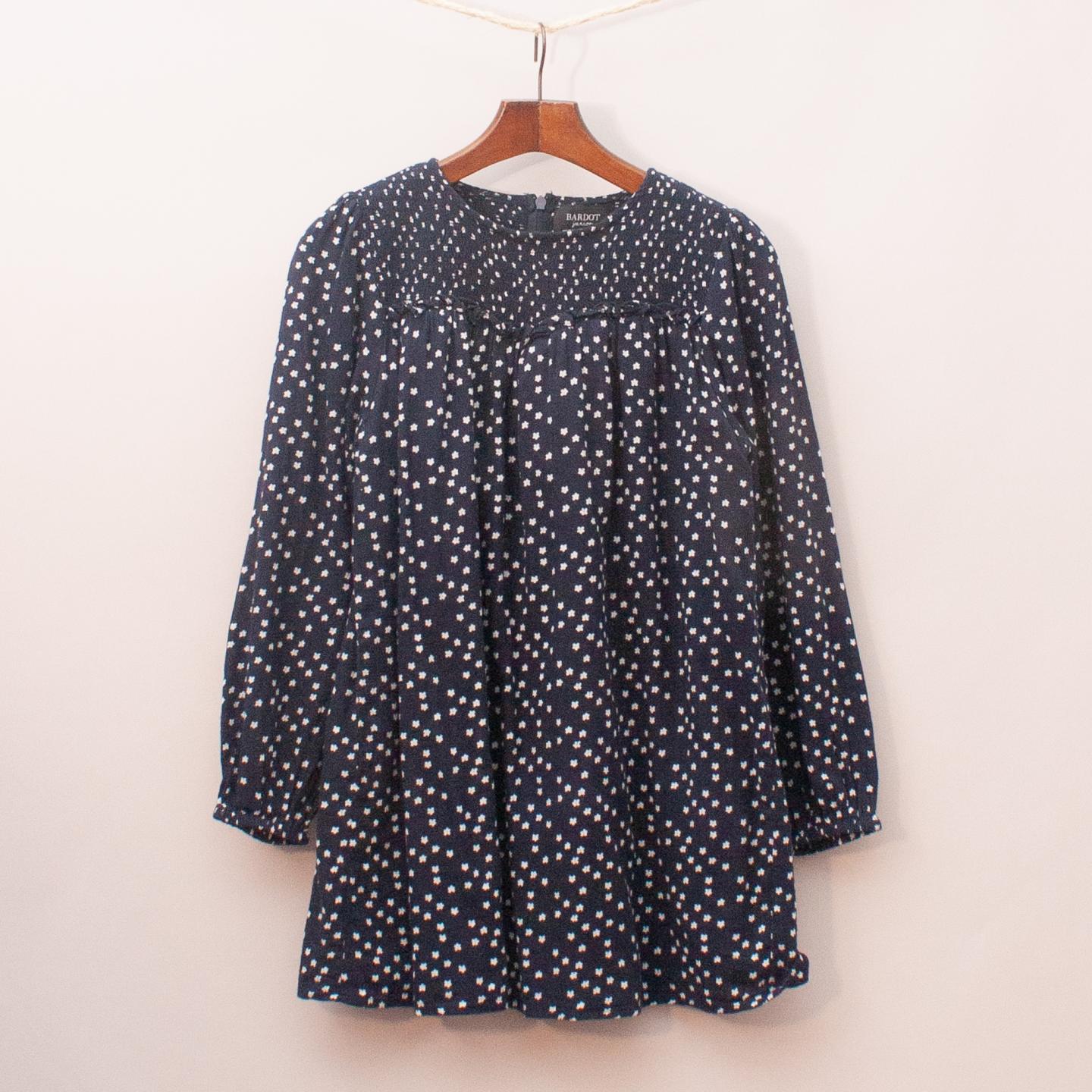 Bardot navy blue smock style dress with white floral pattern throughout, long sleeves and fully lined *100% Cotton