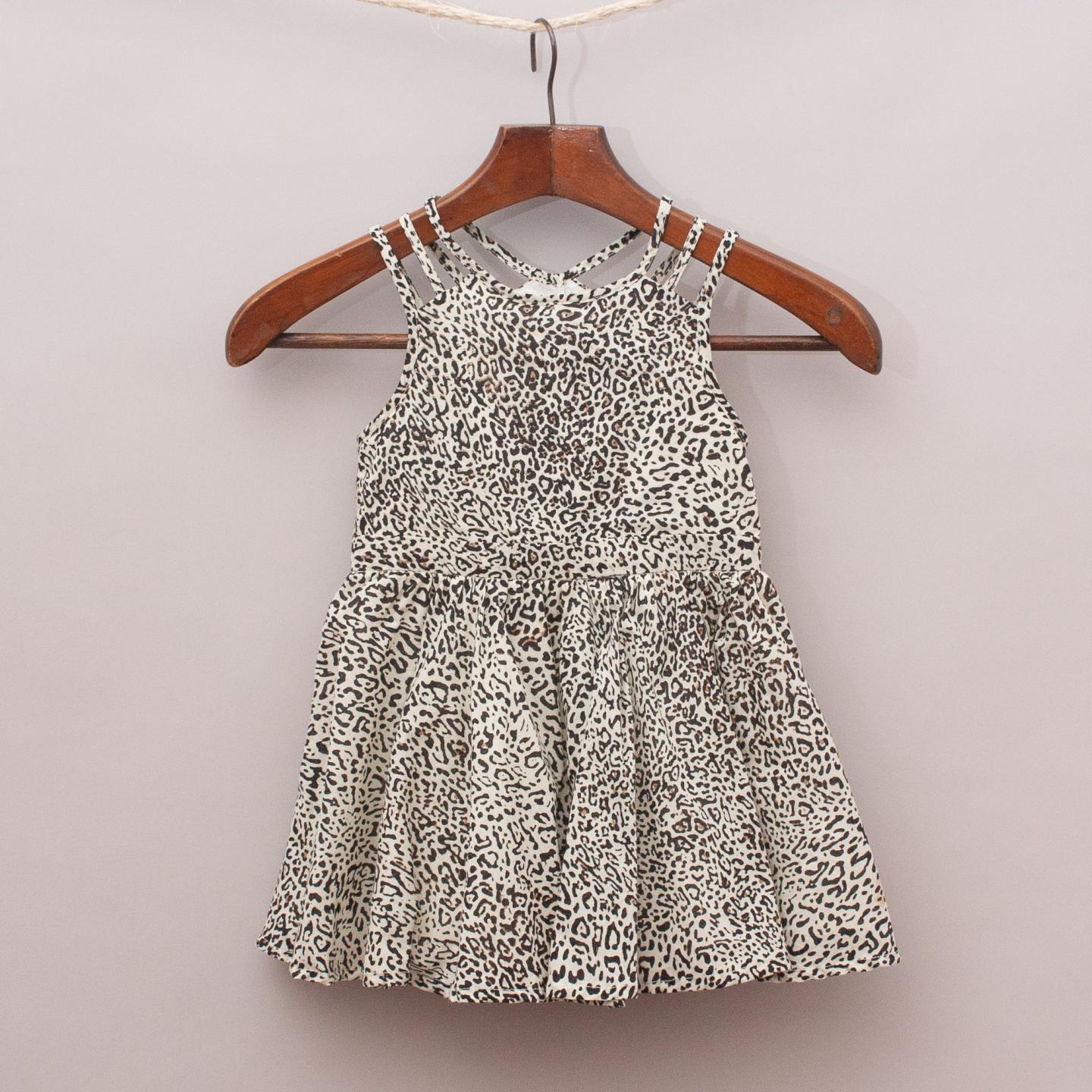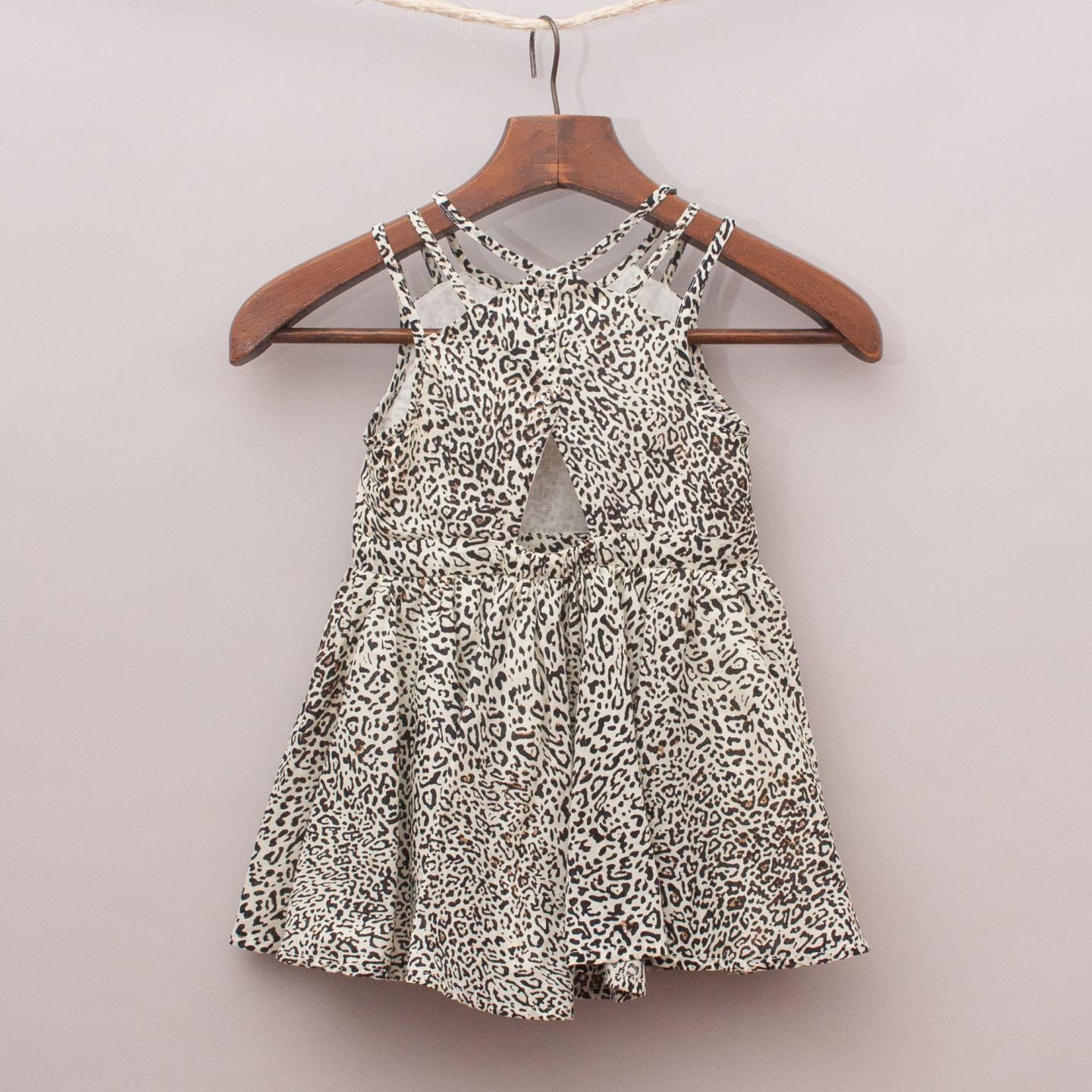 Bardot leopard print dress with full skirt, elastic waistband, button down back closure and triple strap detail