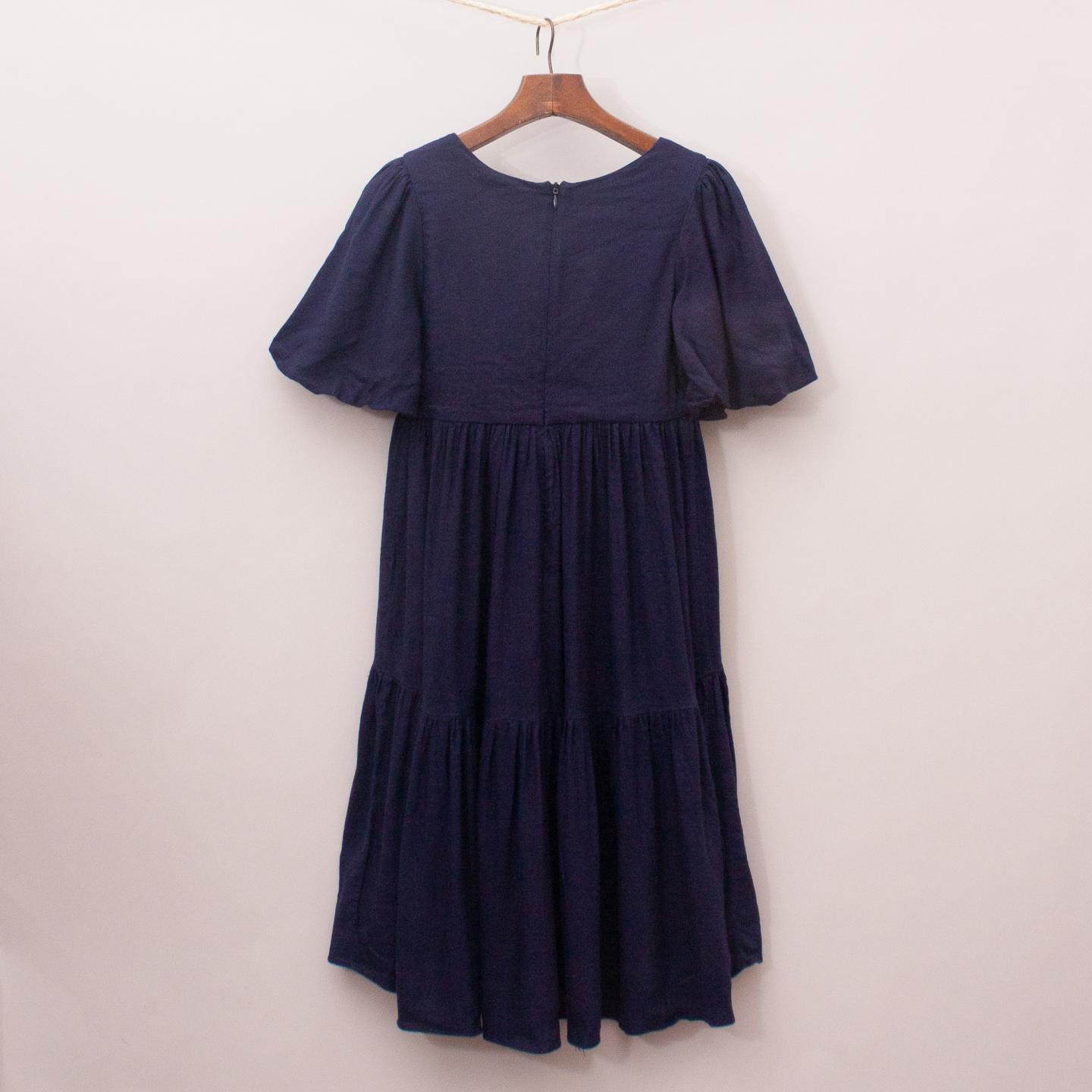 Bardot navy blue linen blend dress with puffed sleeves, gathered neckline and skirt and zip back closure *55% Linen, 45% Viscose