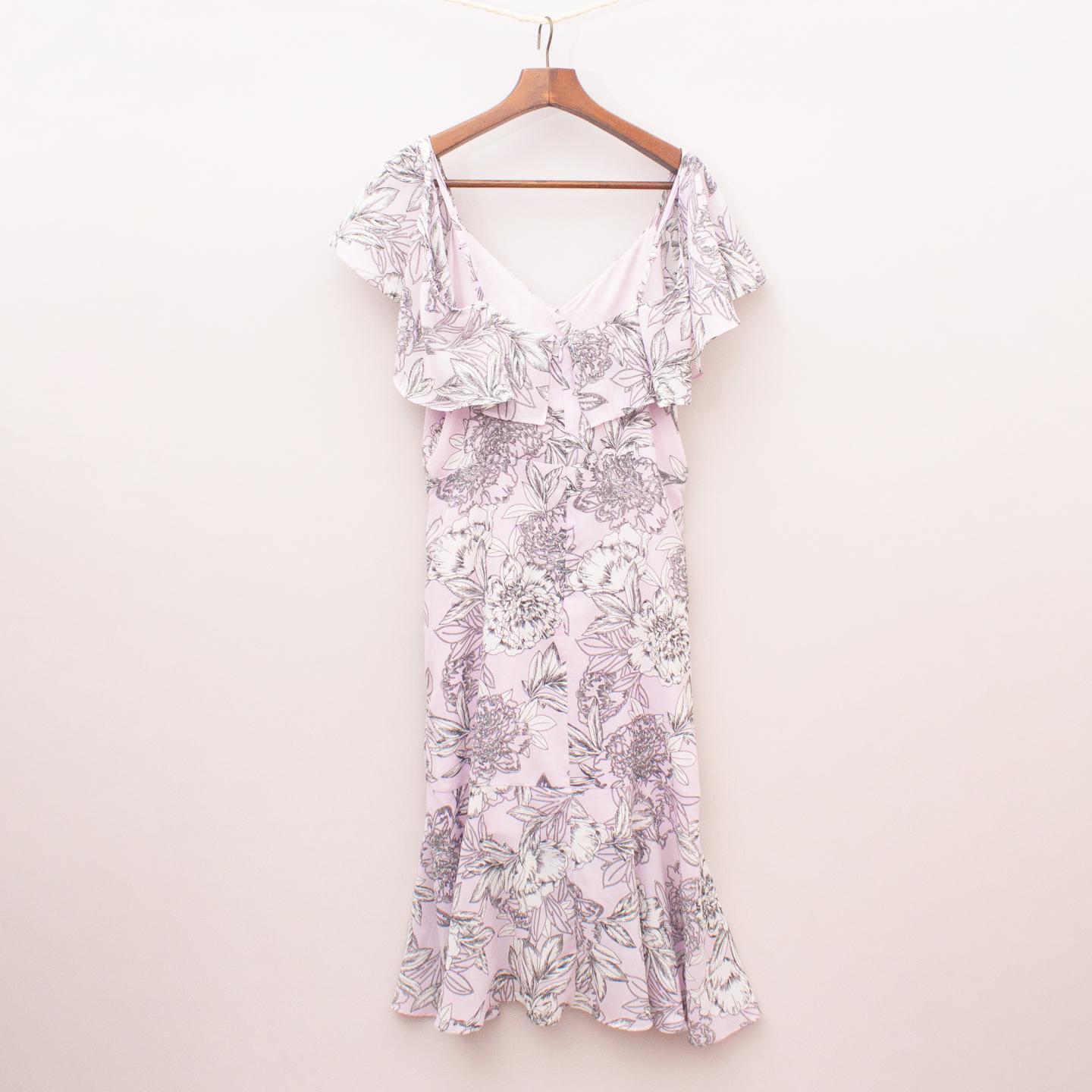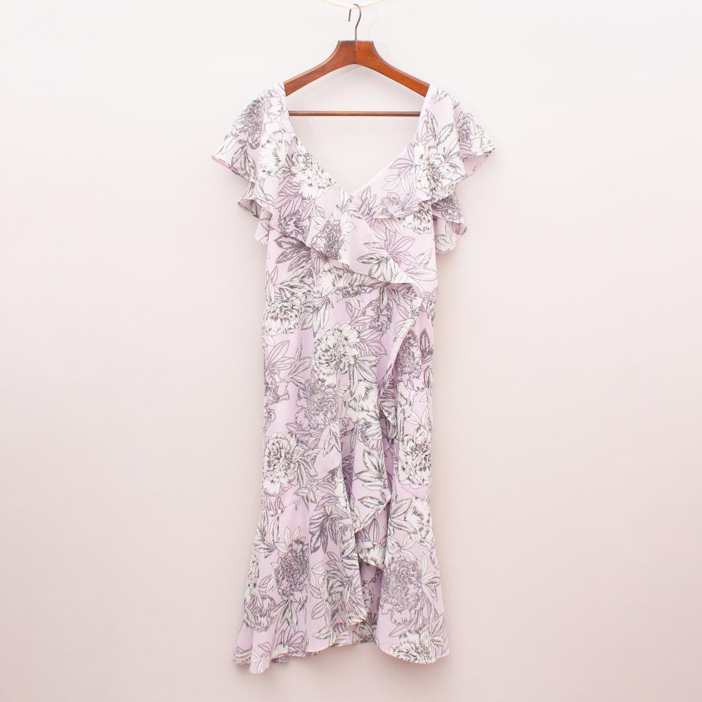 Bardot pastel purple dress with floral pattern throughout, cross-over style skirt, fully lined with floaty ruffle sleeve, adjustable straps and zip back closure *Marked as a size 16