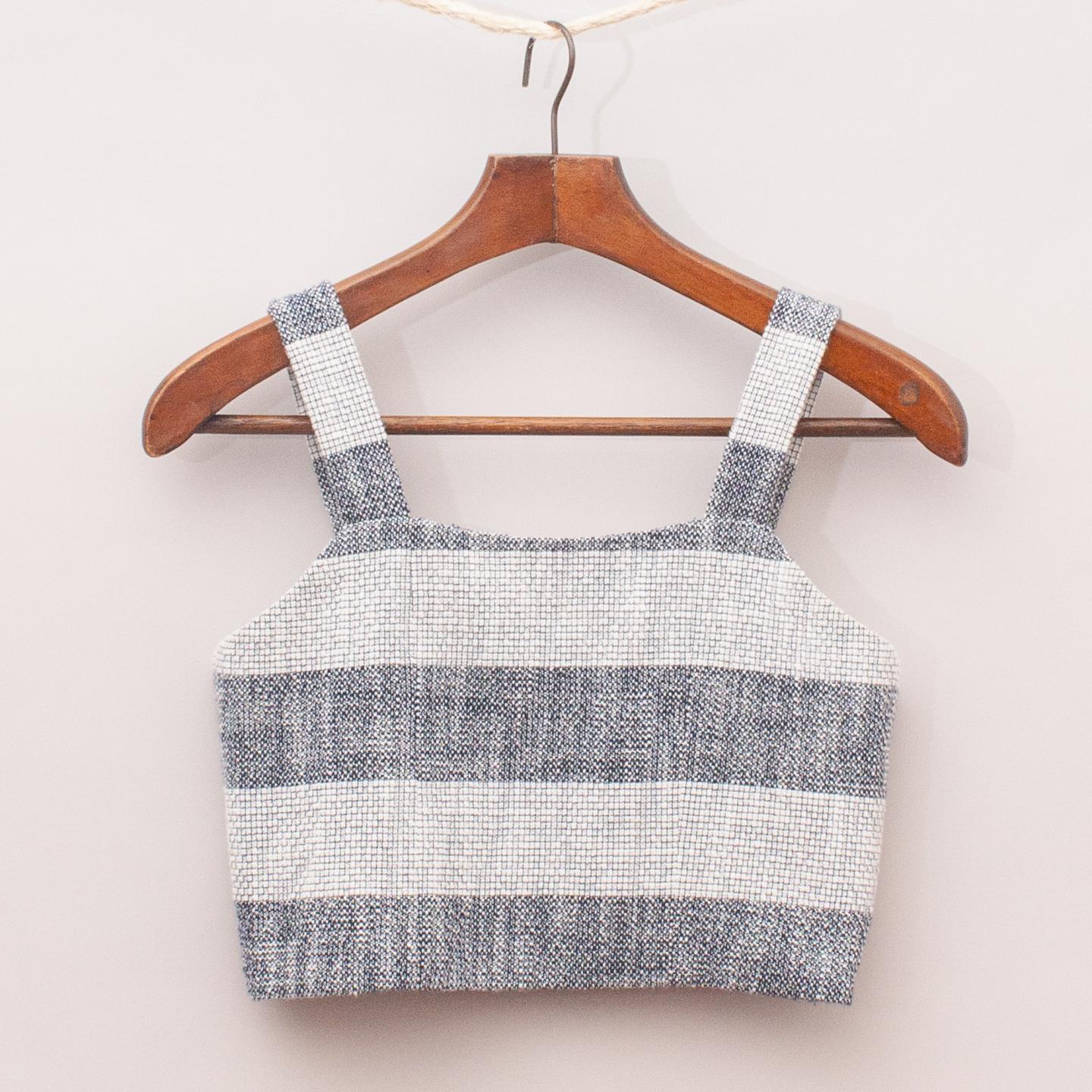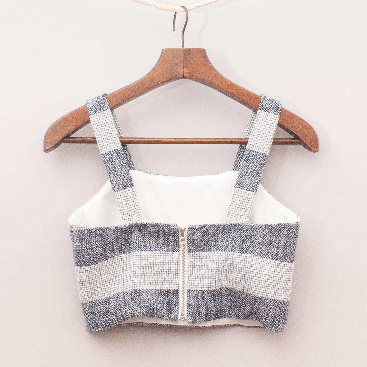 Bardot woven black and cream striped crop top with adjustable straps and zip back closure