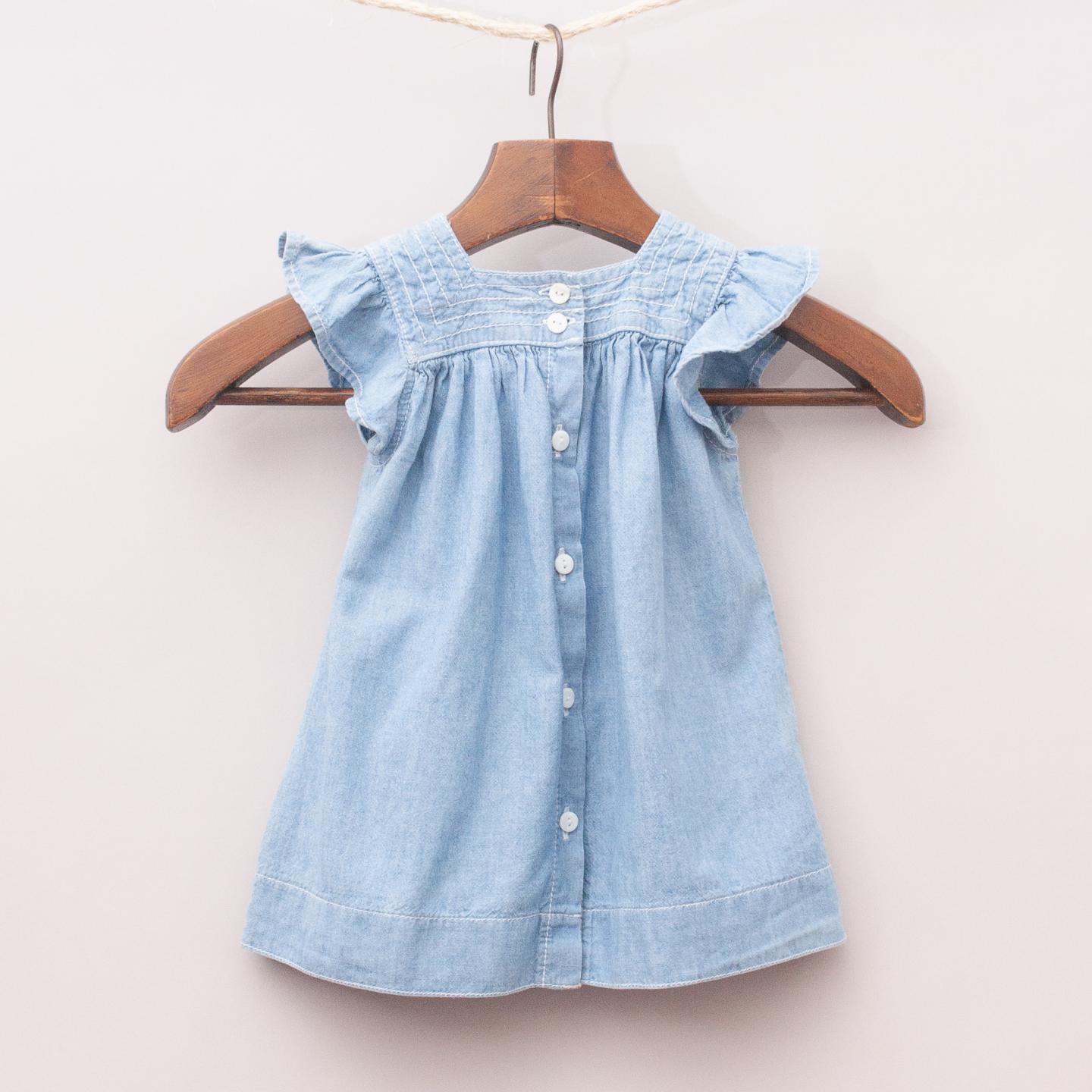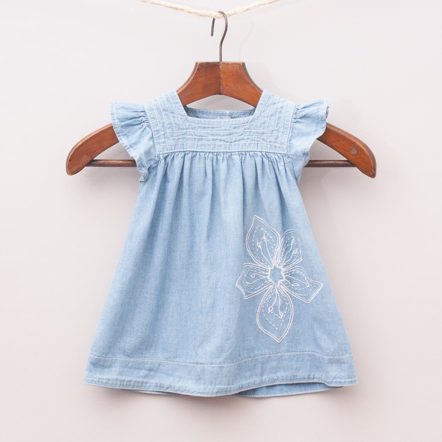 Bebe chambray blue smock style dress/top with ruffle sleeves, embroidered flower on the front and button down back closure *100% Cotton