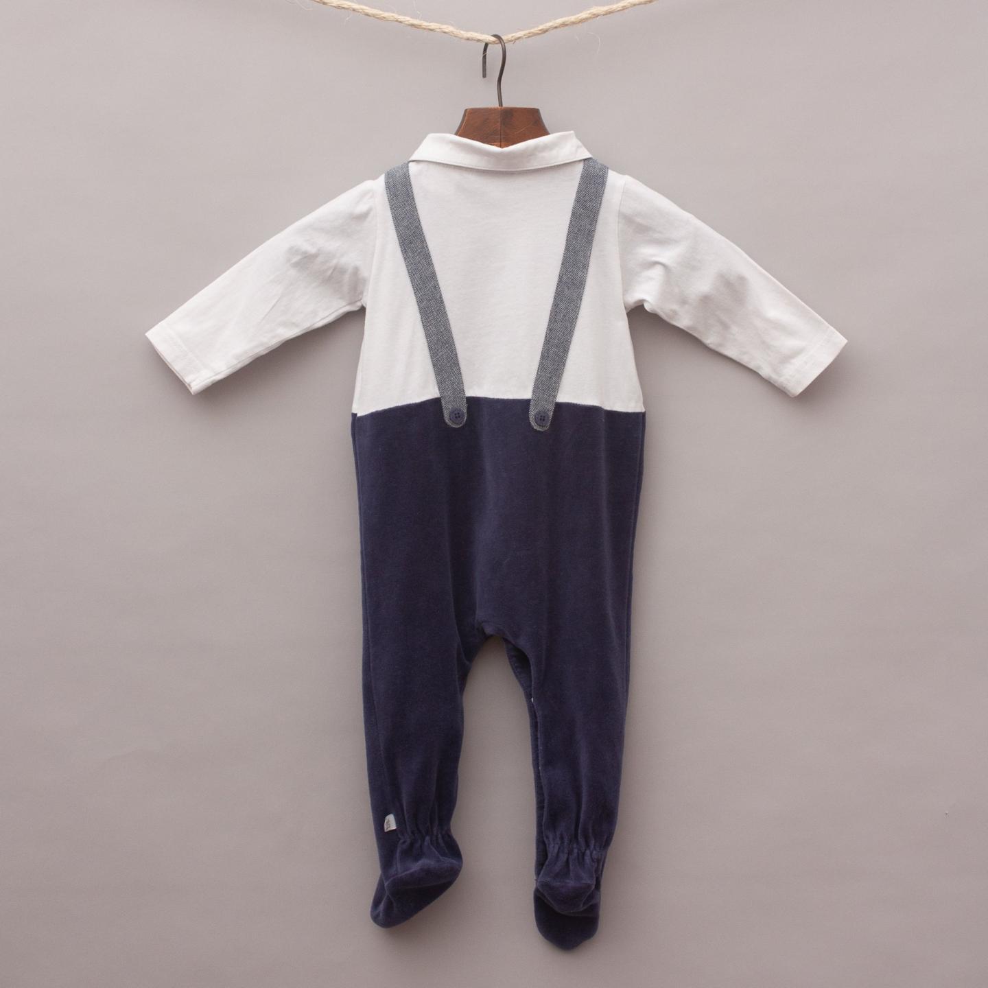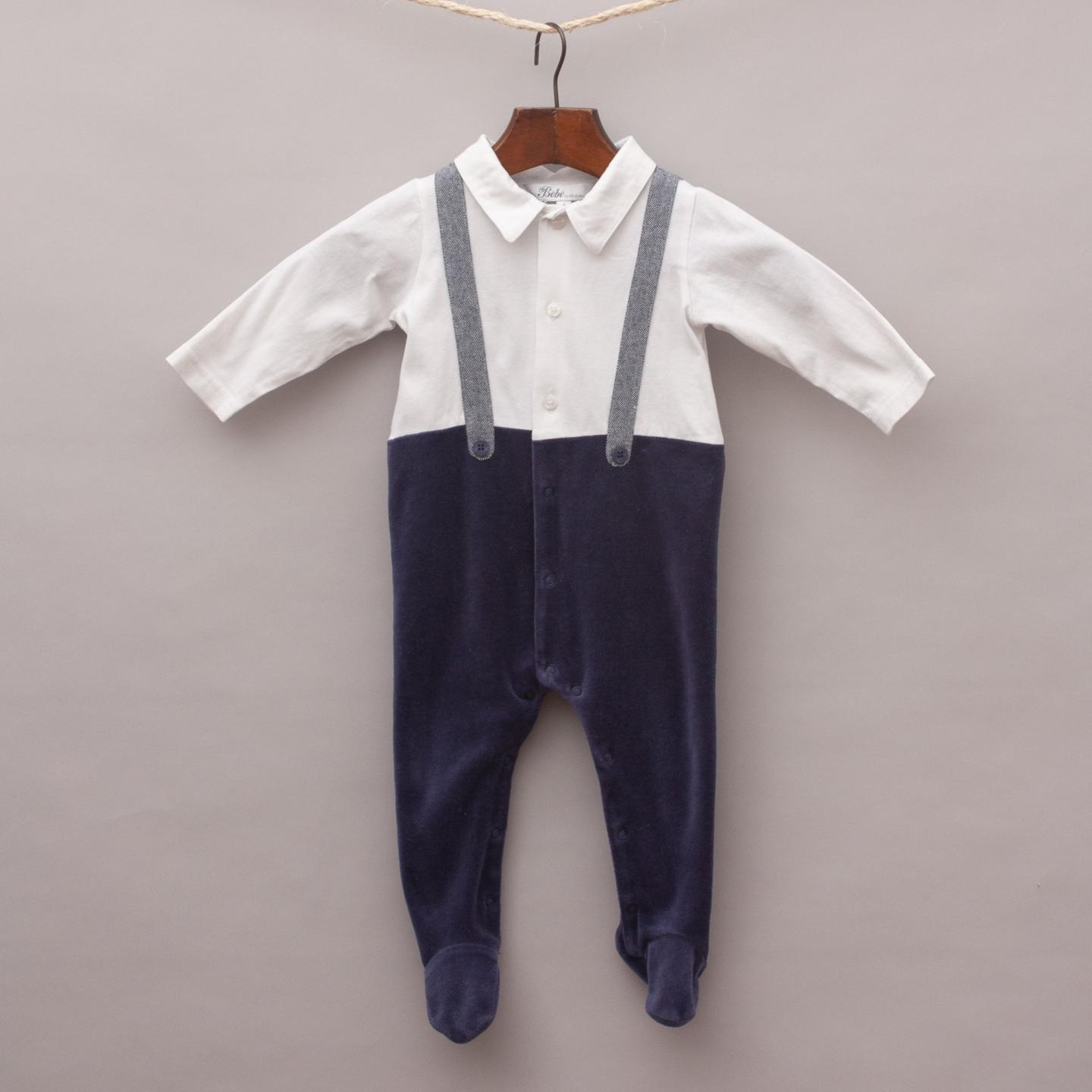 Bebe white and navy blue romper with velvet legs, plain white shirt top with grey attached suspenders and full button down front