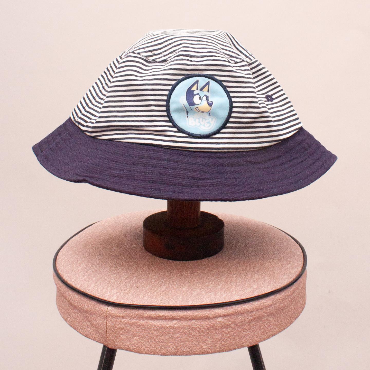 Bluey navy blue and white striped buked hat with embroidered Bluey logo on the front - Size 4-6