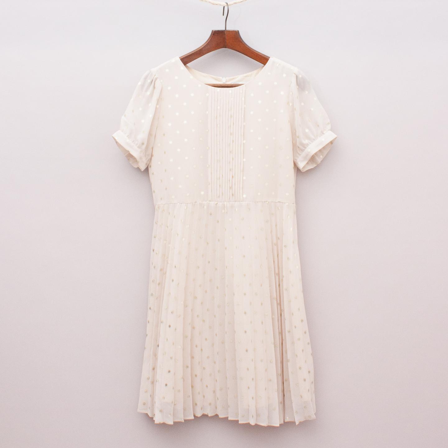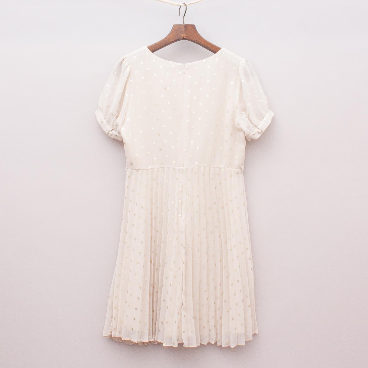 Blush cream pleated dress with gold polka dots throughout, sheer puffed sleeves and fully lined bodice with zip back closure. Inclues thin belt loops to add a belt *Marked as a size 16