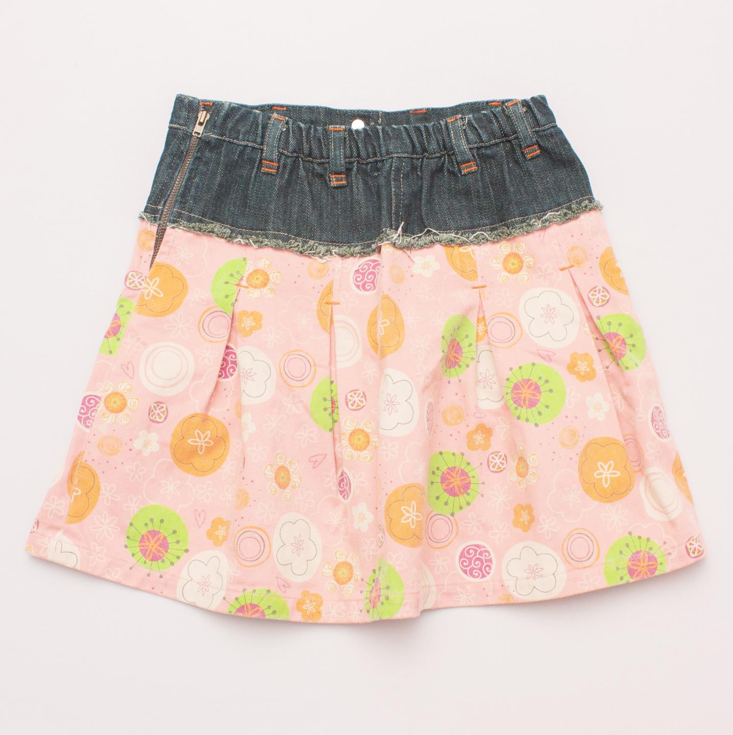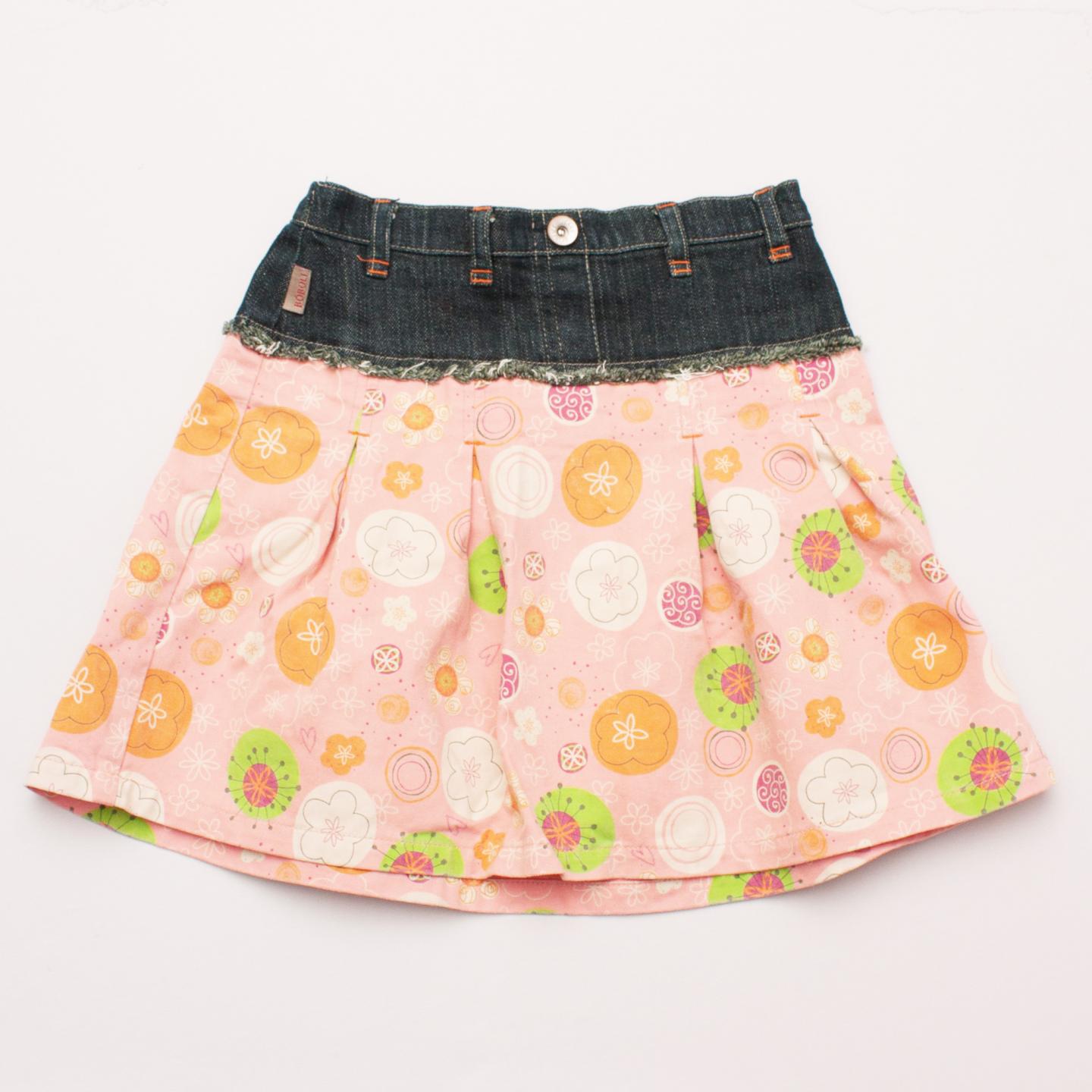 Boboli Kids pink and floral print pleated skirt with wide denim waistband, belt loops, elastic waistband and side zip fastening