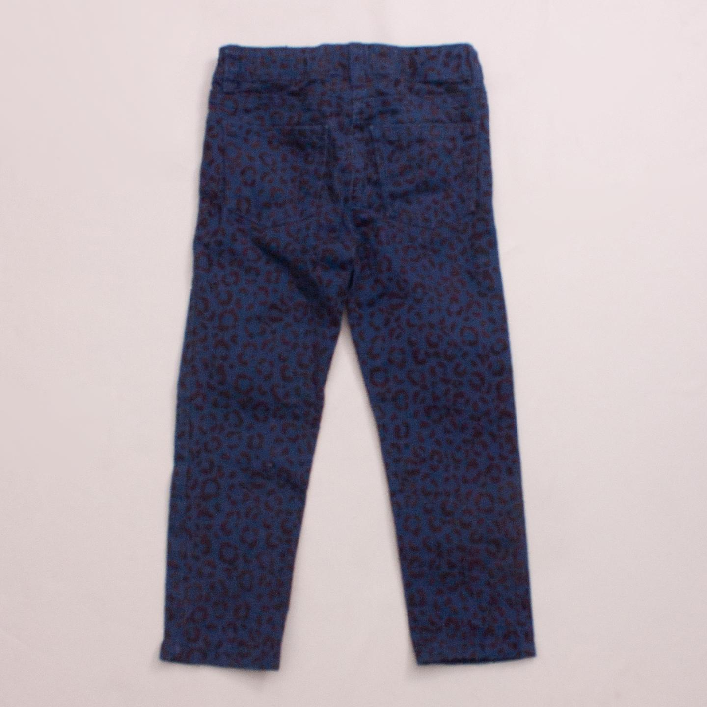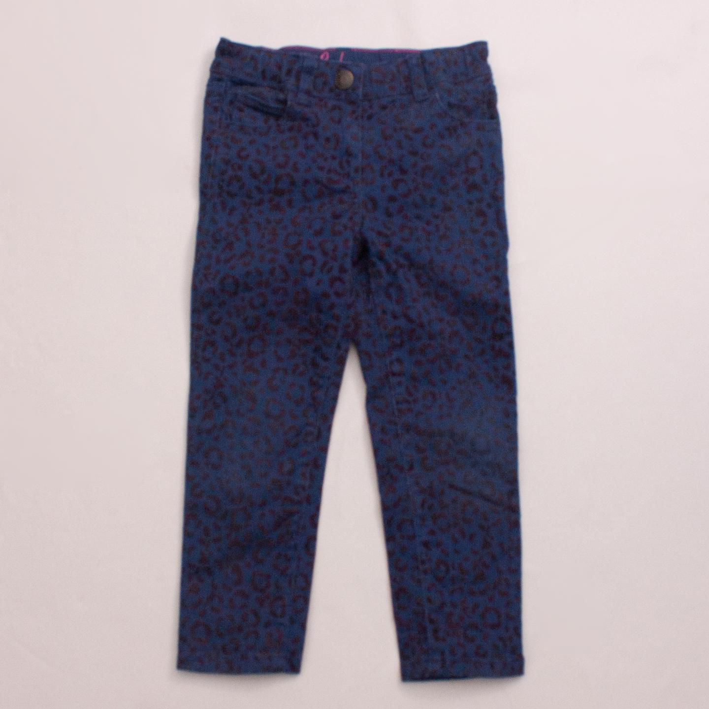 Boden navy blue and black leopard print pants with front and back pockets, belt loops and button/zip closure *99% Cotton, 1% Elastane