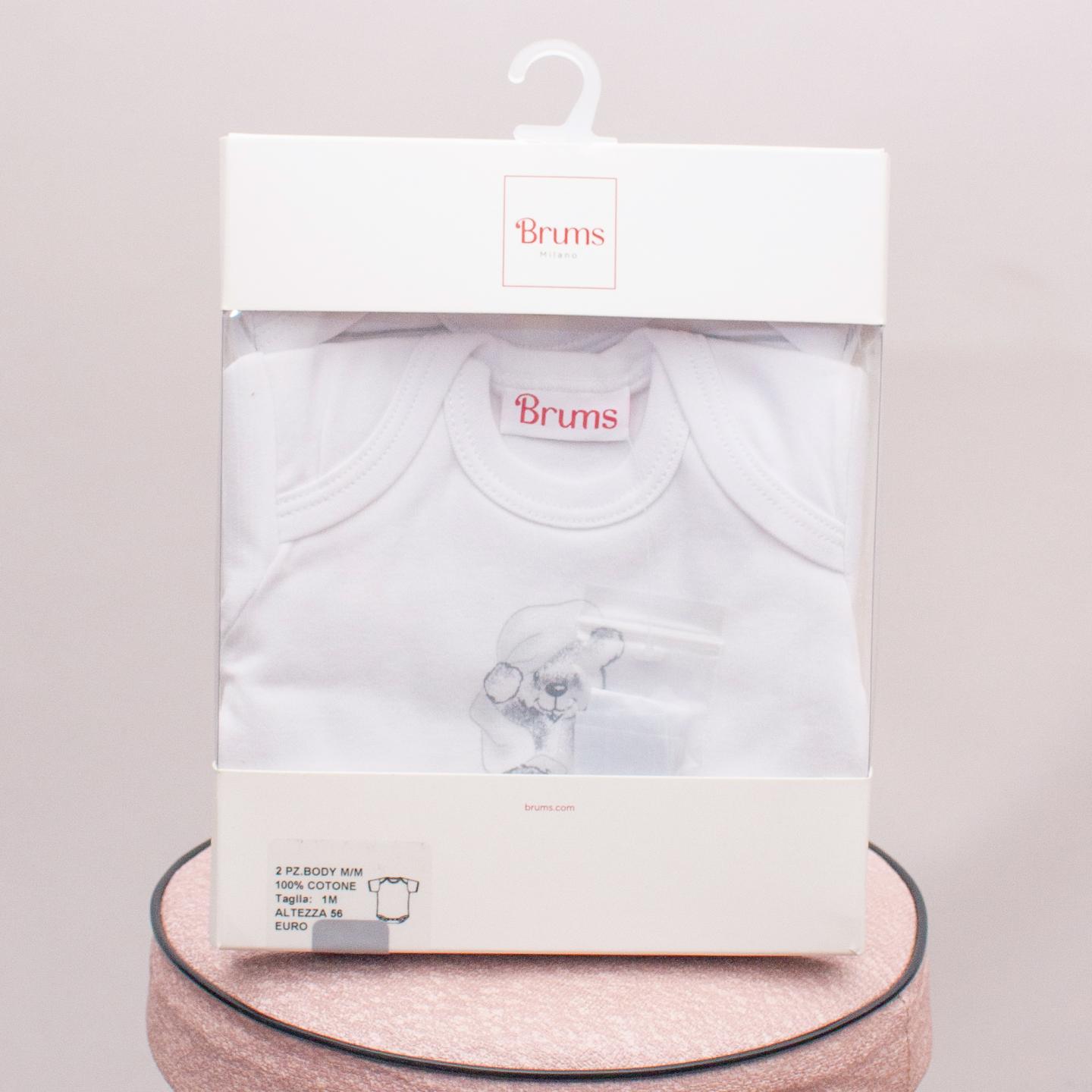 Brums "brand new in box" white cotton short sleeve rompers with button closures