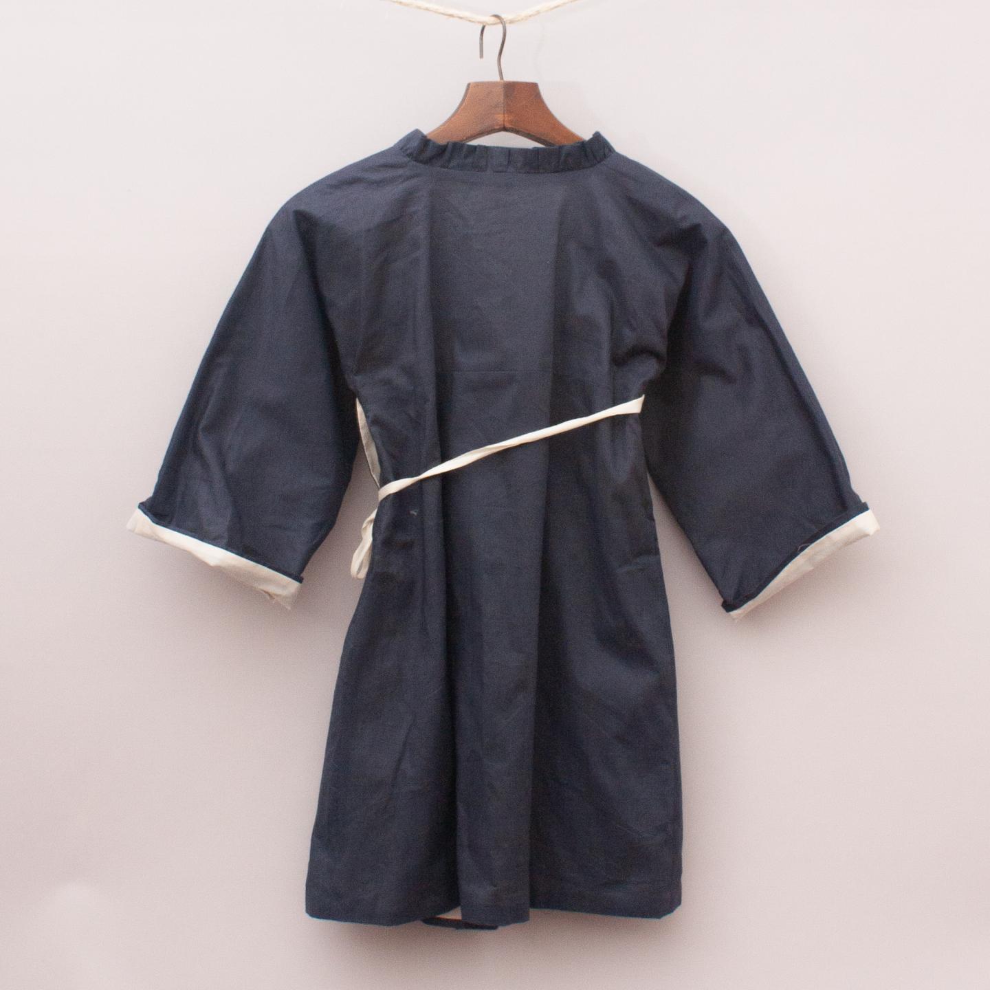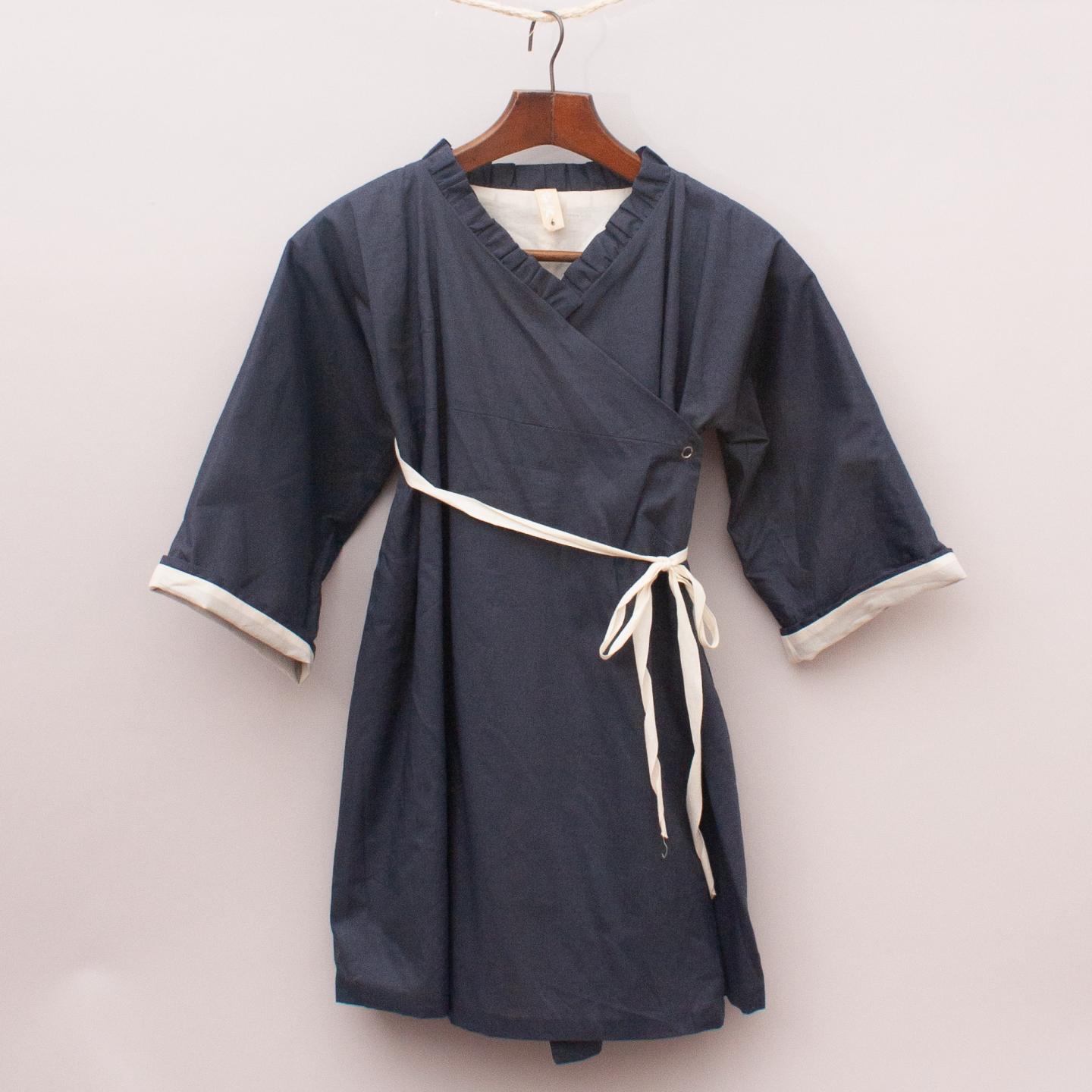 Buzz Buzz navy blue wrap dress with pleated neckline, tie up waist and rolled cuffs *100% Cotton