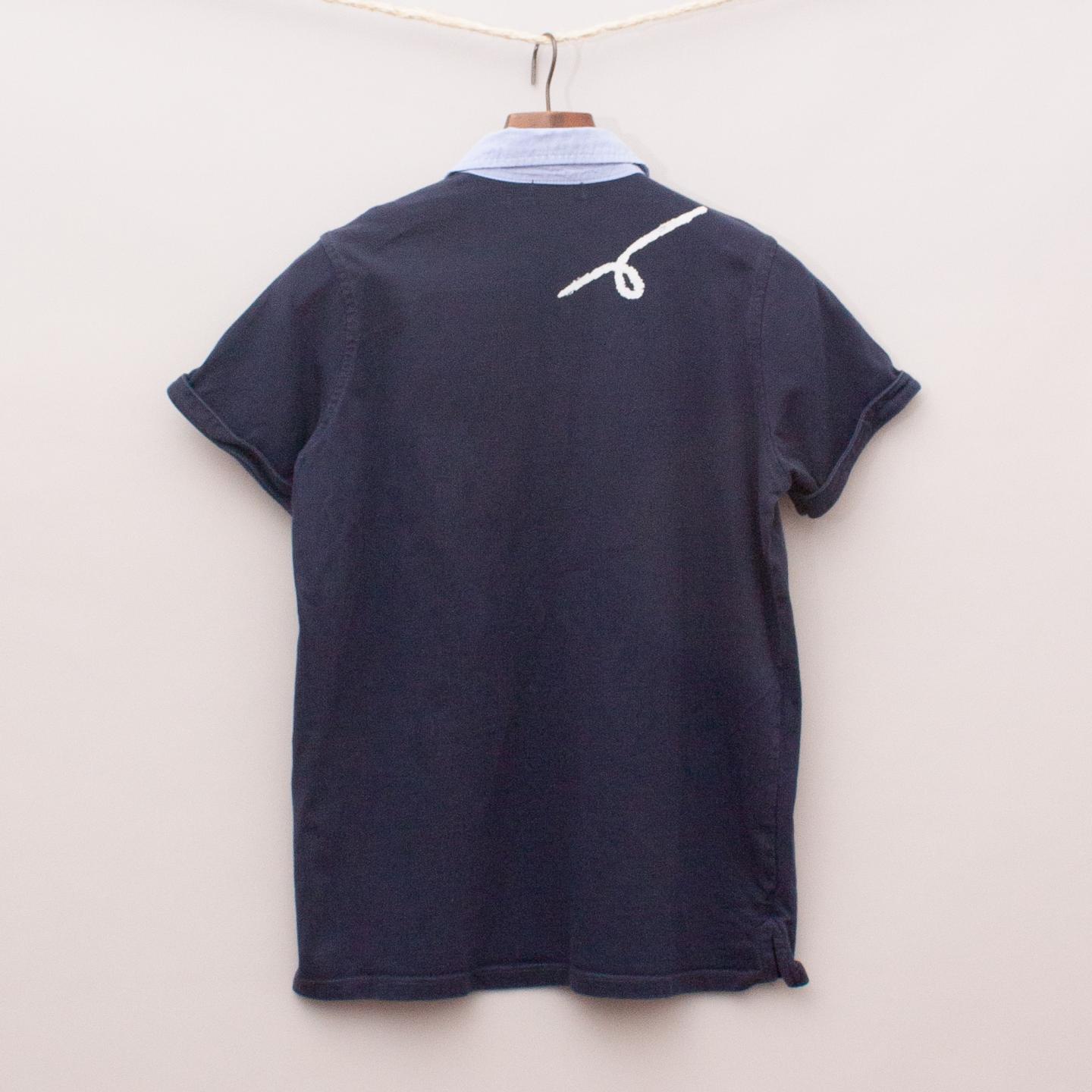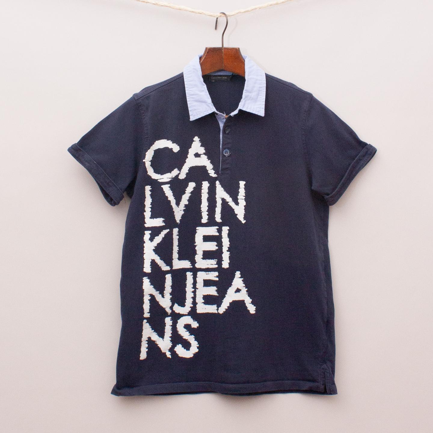 Calvin Klein navy blue short sleeve polo shirt with shirt style collar, rolled cuffs and printed logo on the front