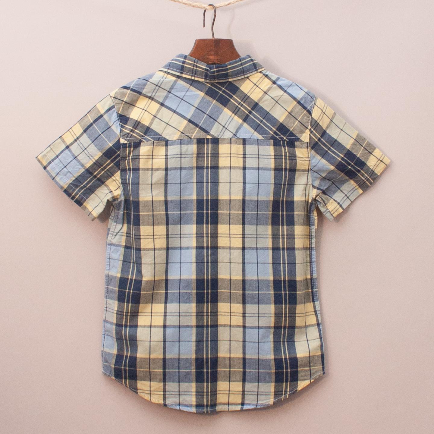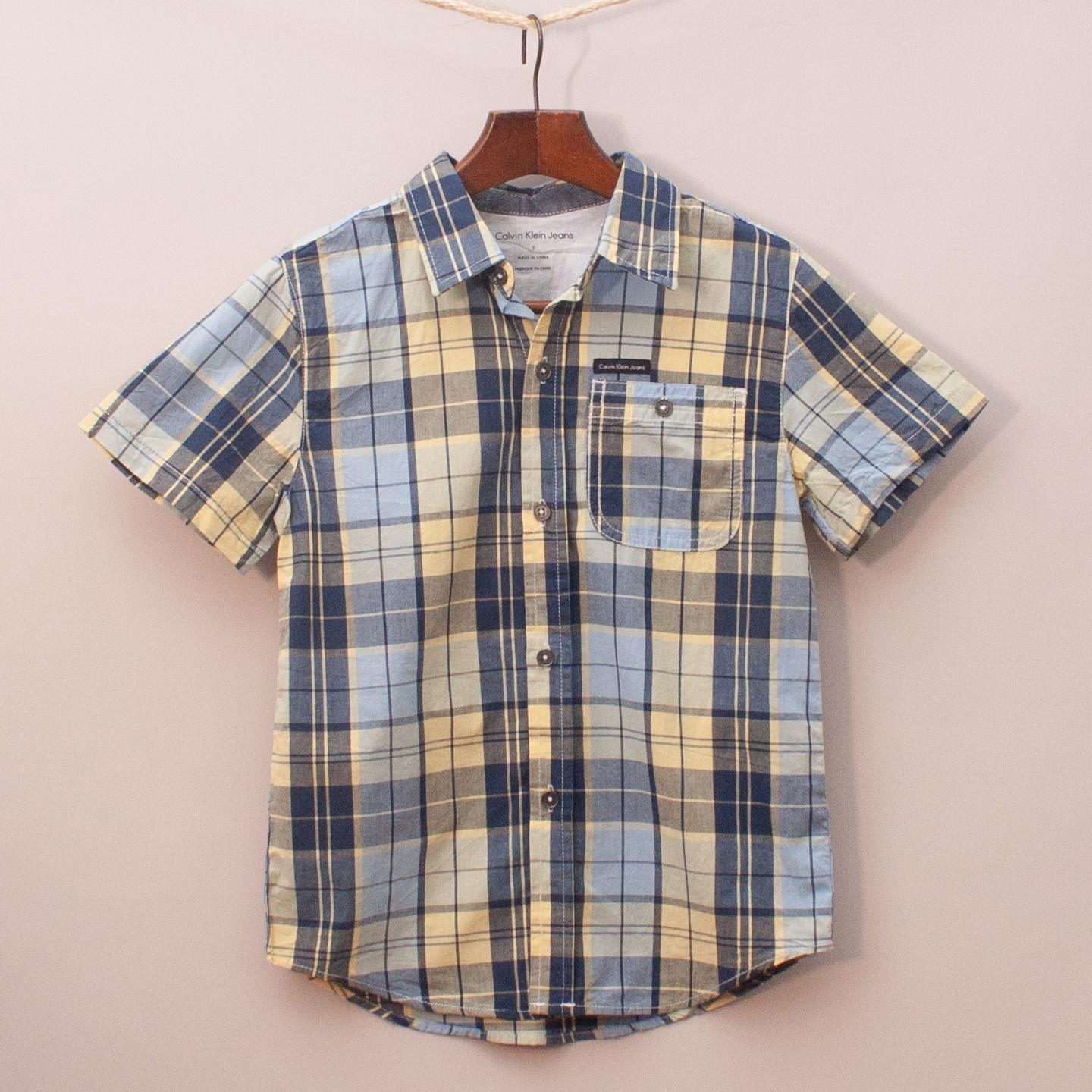 Calvin Klein yellow and blue plaid short sleeve shirt with single front pocket and full button down front *100% Cotton