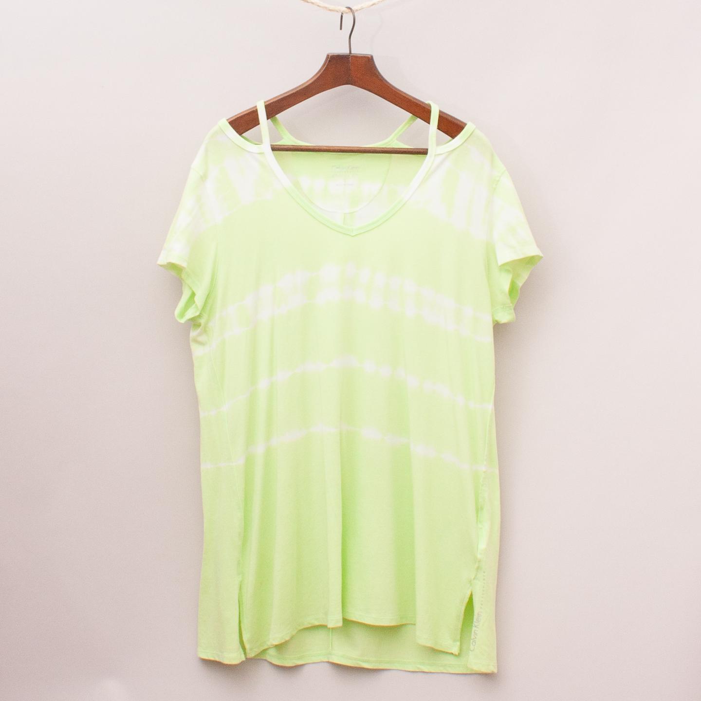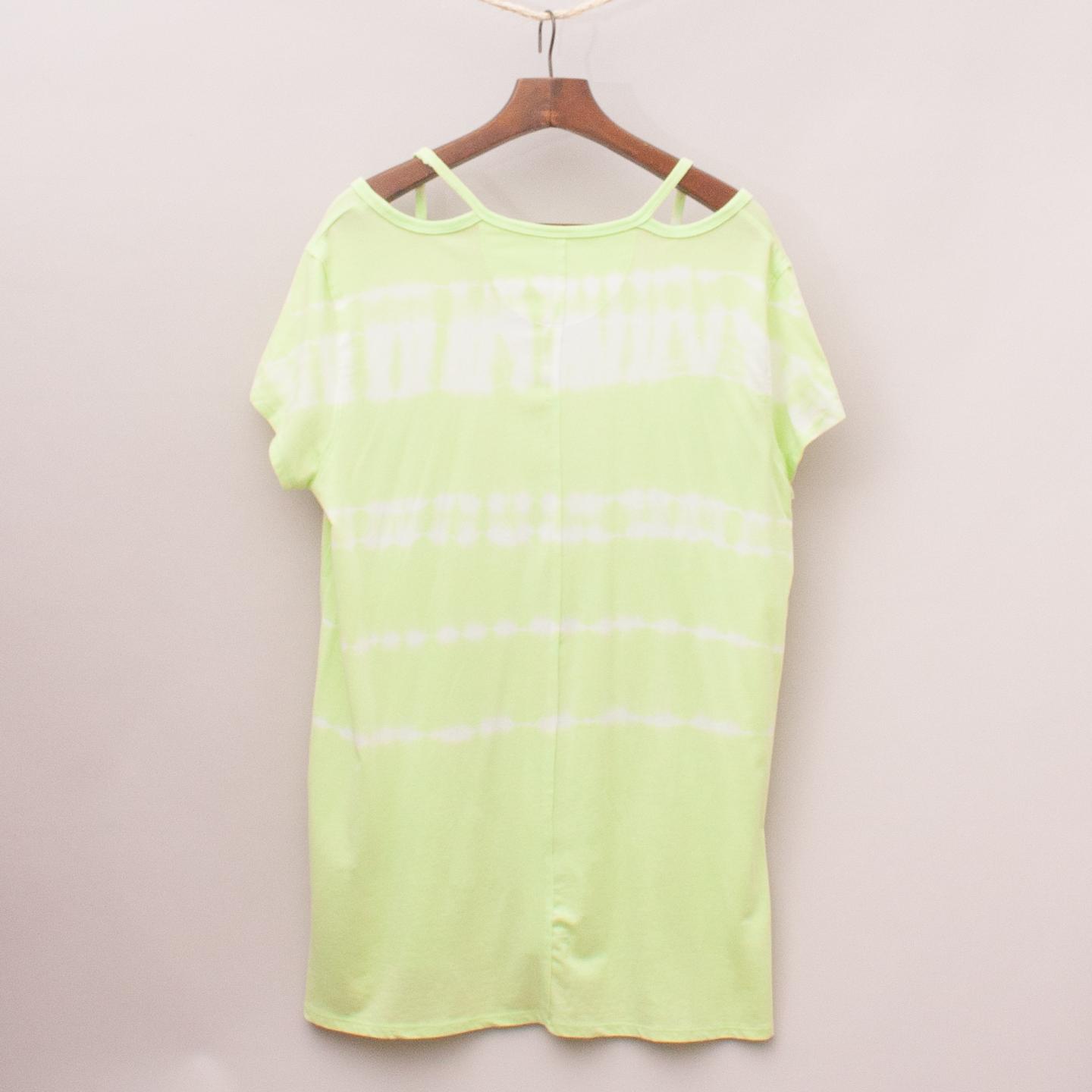 Calvin Klein lime green and white tie-dye dress with off the shoulder sleeves and flippy skirt *58% Cotton, 38% Modal, 4% Spandex