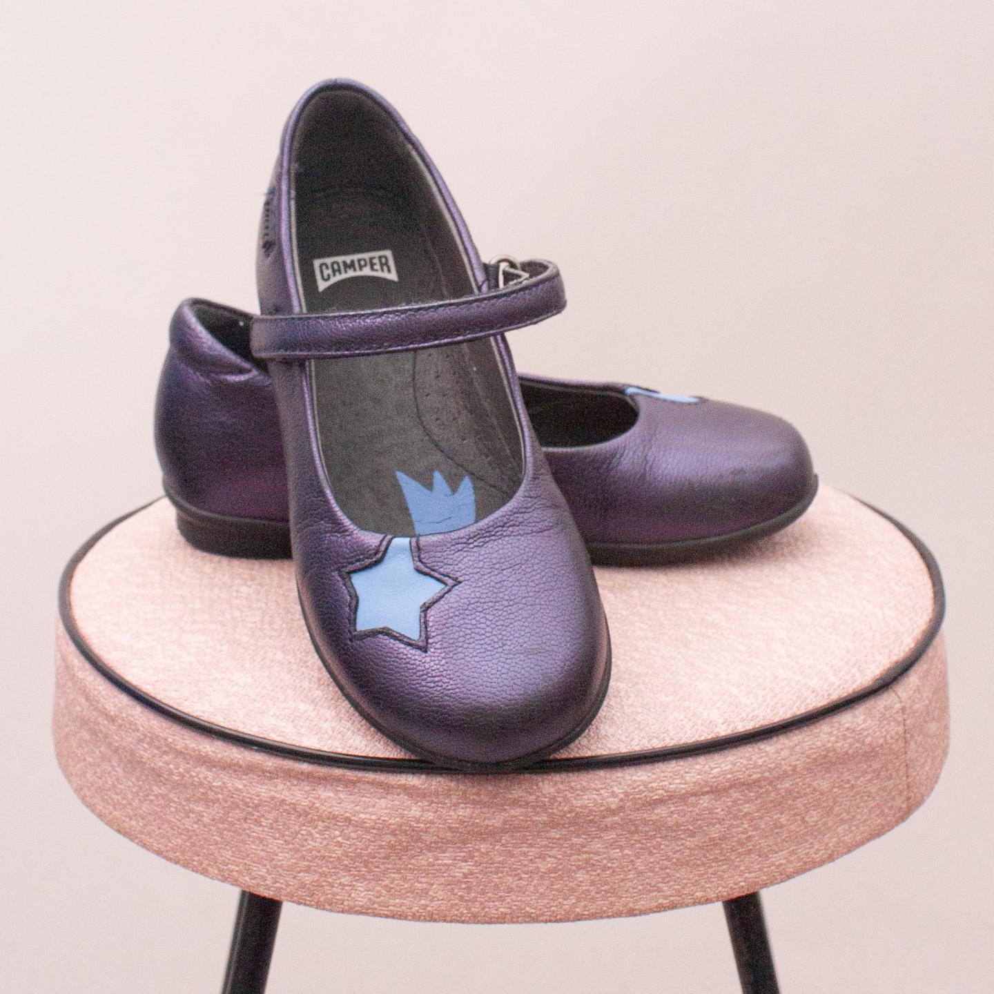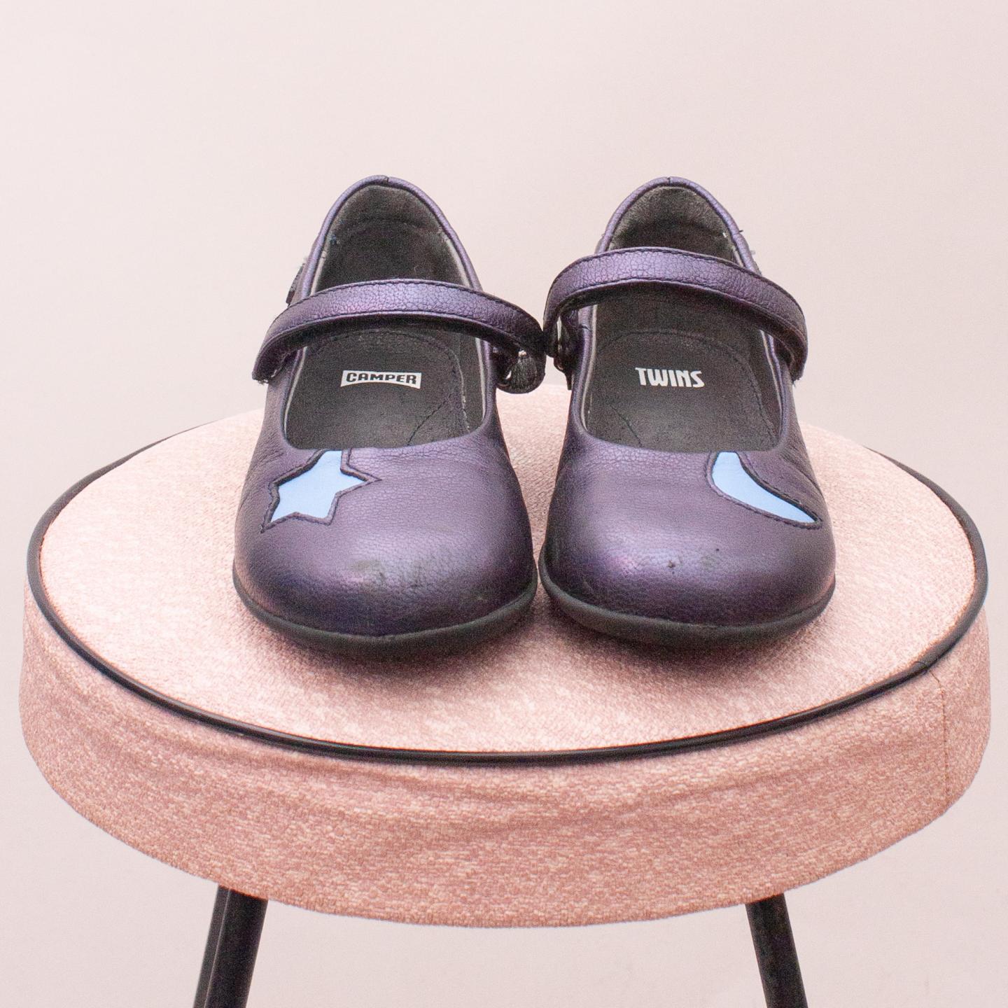 Camper "in box" metallic navy blue slip on's with single velcro strap, light blue leather star and moon detail and rubber soles - EU 26 (Age 3 approx.)