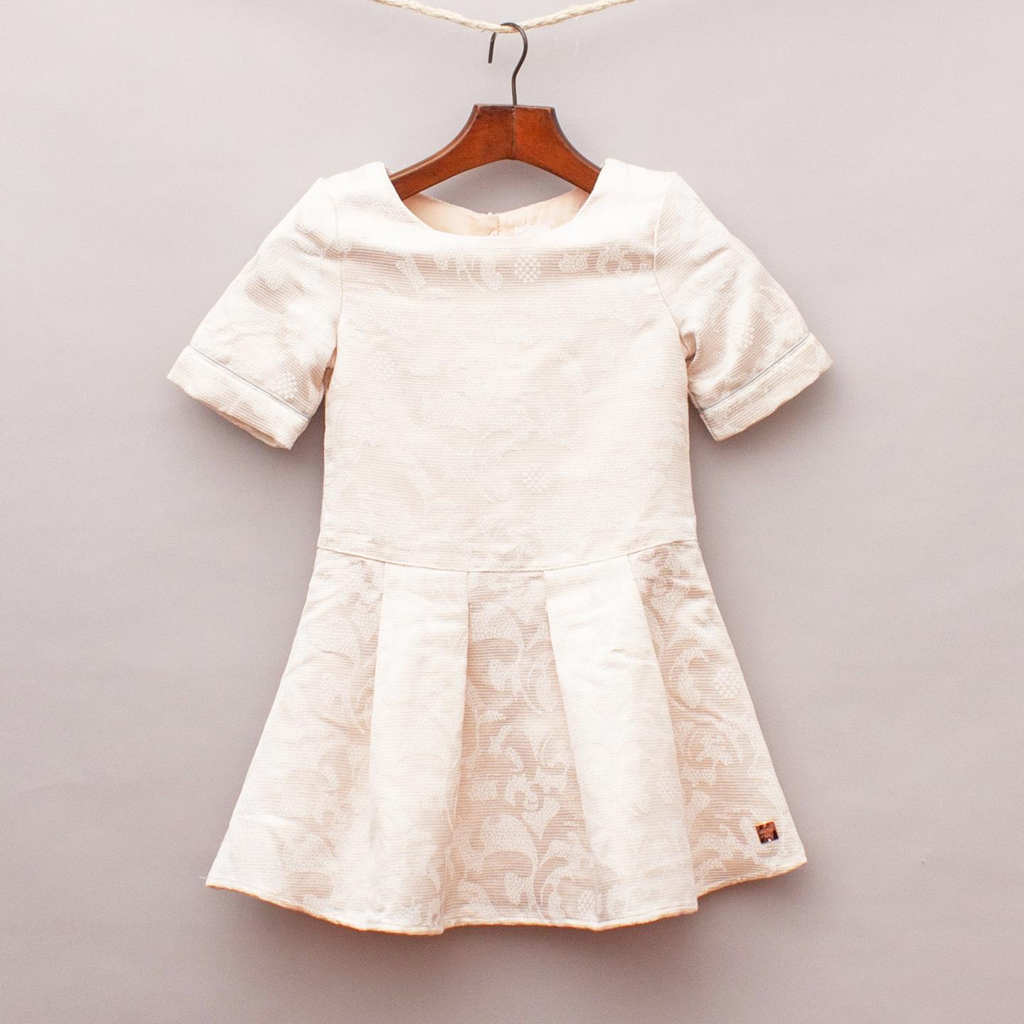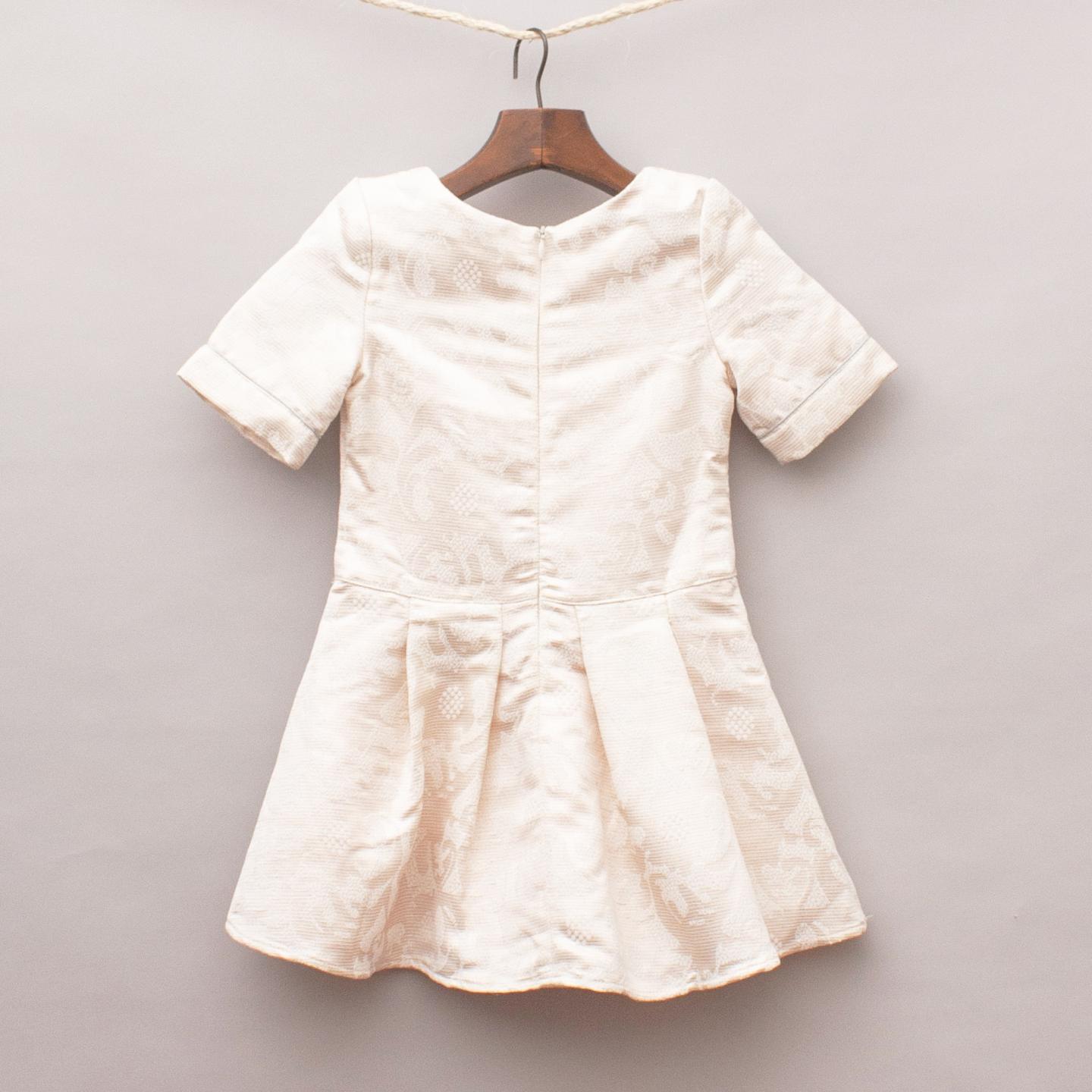 Carrement Beau pastel pink patterned dress with 3/4 sleeves, pleated skirt, fitted bodice with metallic thread and trim throughout and zip back closure