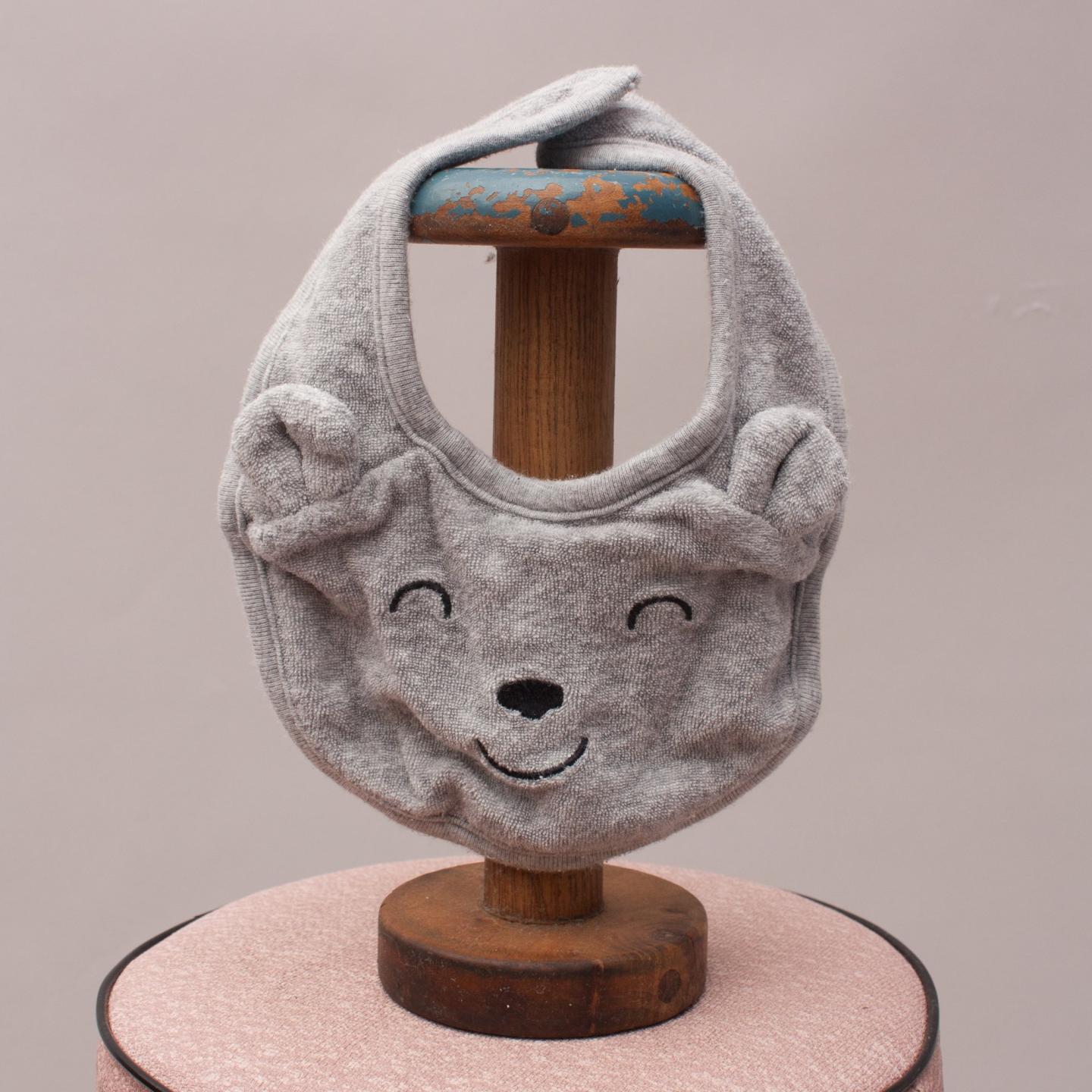 Carter's grey terry toweling bib with a bear face and added ears and velcro closure