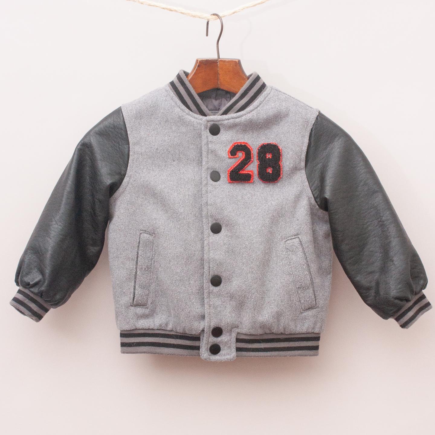 Carter's grey bomber jacket with faux leather sleeves, two front pockets, striped neckline, cuffs and waistband with embroidered '28' on the front and full button down front *92% Polyester, 3% Cotton, 2% Other