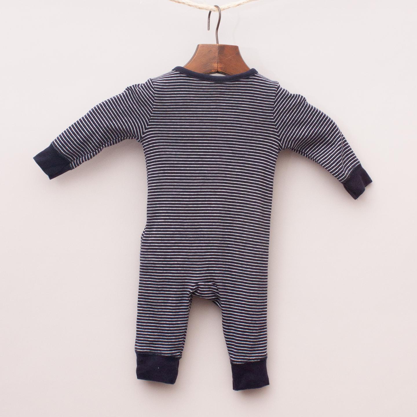 Carter's navy blue and pinstripe long sleeve romper with small bear pocket, solid blue neckline and cuffs with wooden button closures *100% Cotton