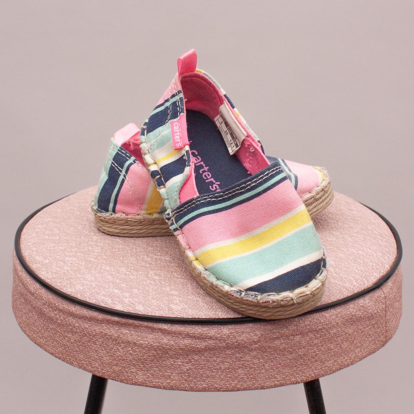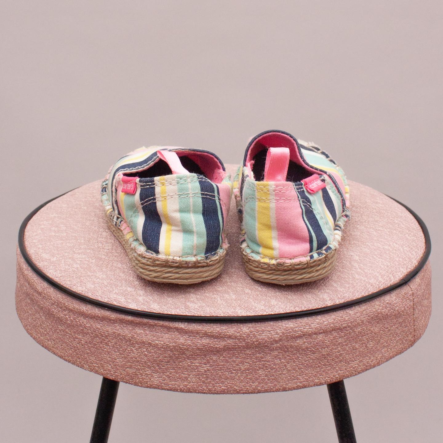 Carter's multi coloured striped slip on's with rope edged soles and elastic detail - Size US 5 (0-12Mths Approx.)