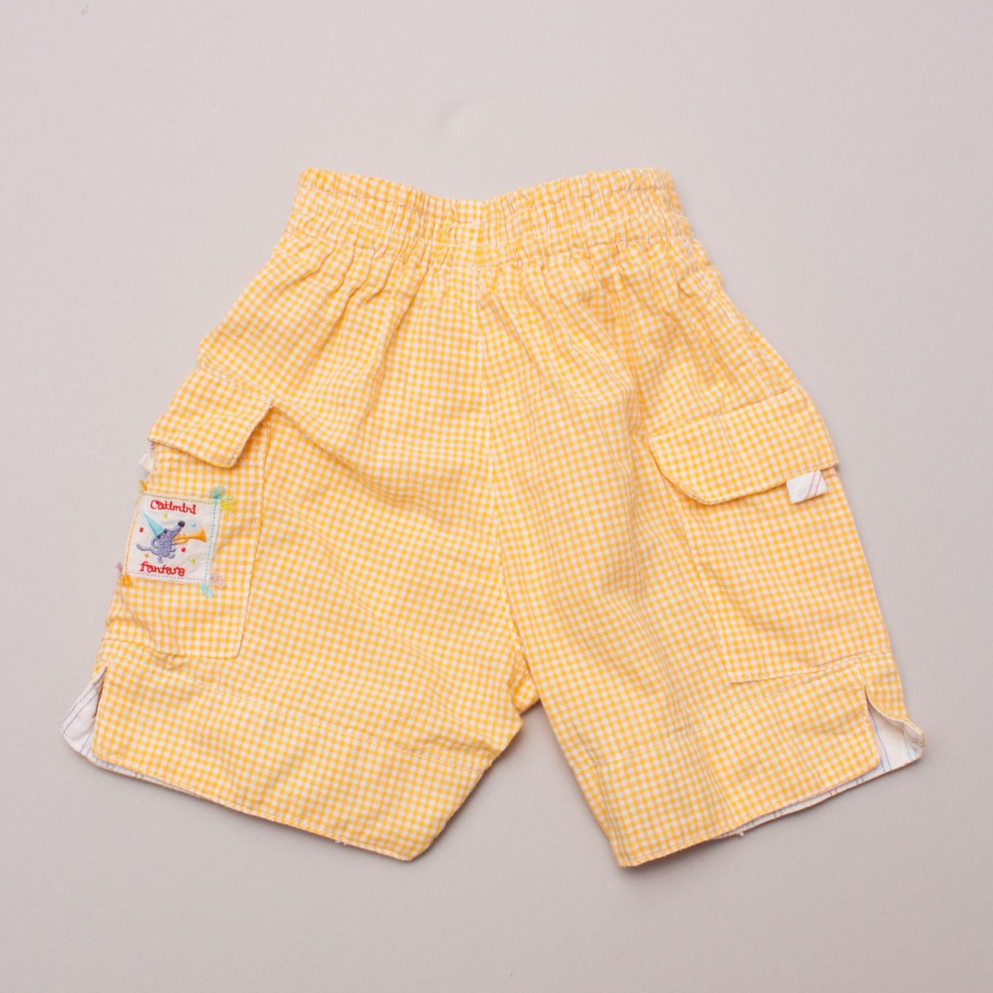 Catimini white and yellow checked shorts with pockets, embroidered image on the side and elastic waistband