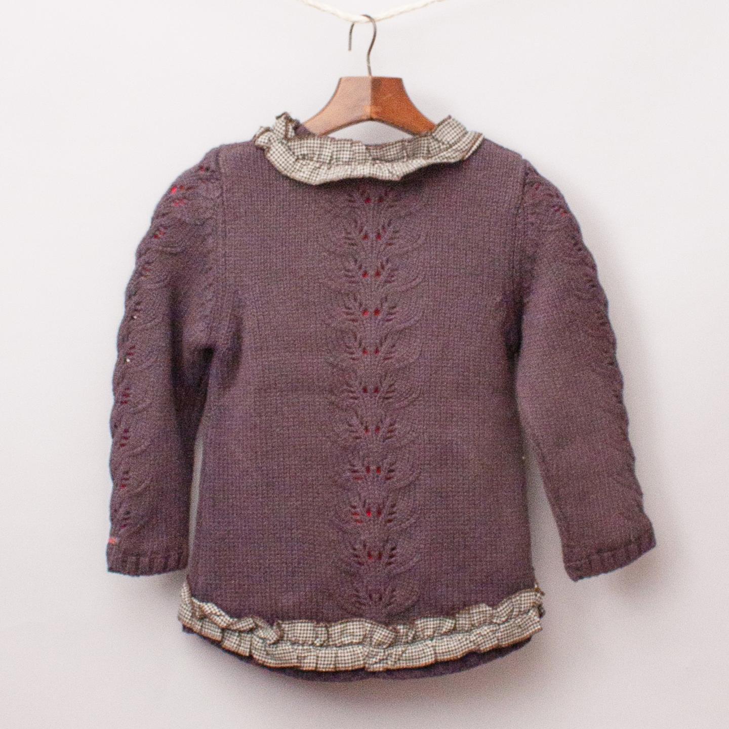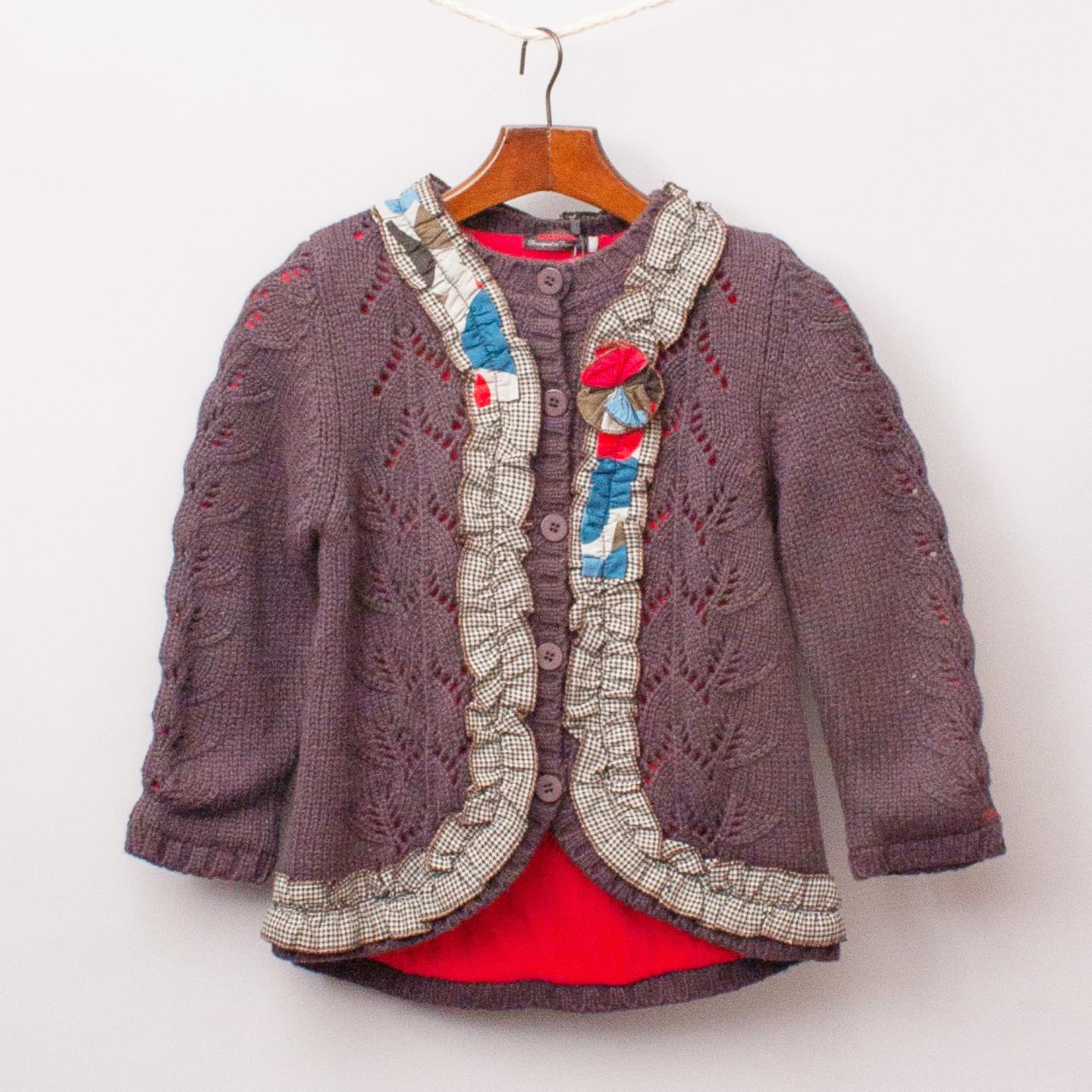 Catimini "brand new with tags" brown cable knit cardigan with pleated fabric front, fabric flower and bright red lining
