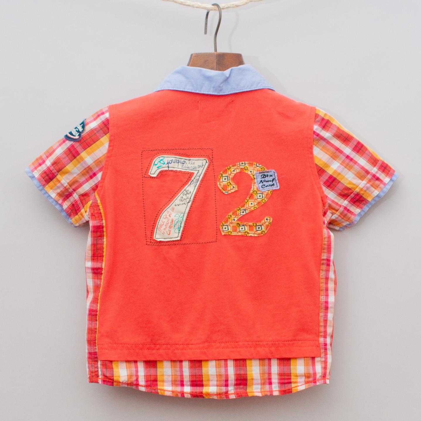 Catimini red, orange and white plaid short sleeve shirt with pinstripe collar and cuff detail, embroidered patches on the front and sleeve with single front pocket and full button down front