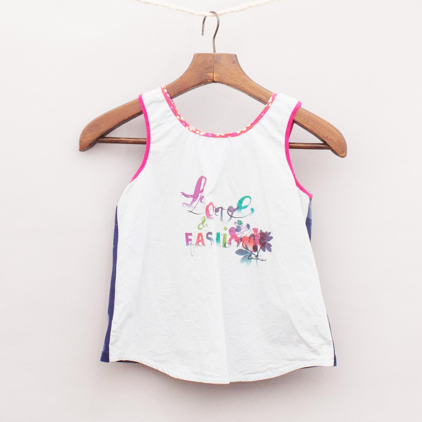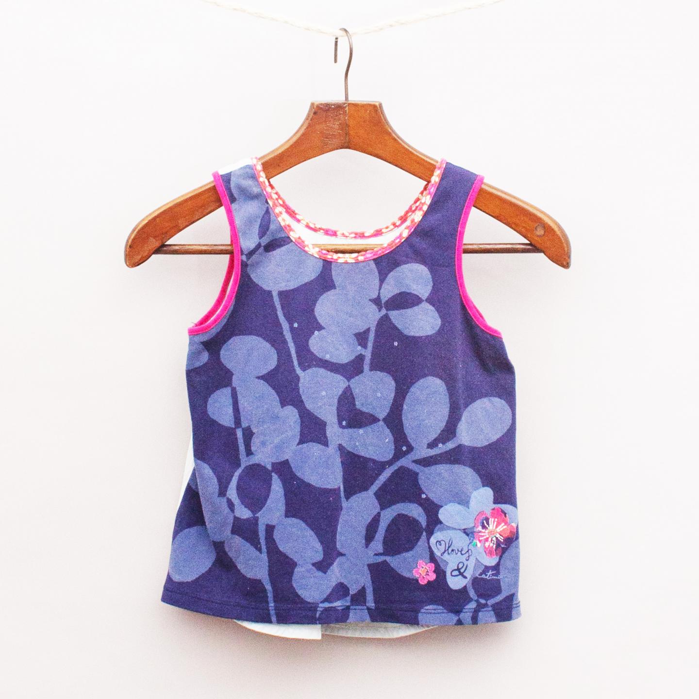 Catimini navy blue floral singlet top with hot pink and floral trim, light blue reverse side with printed slogan and printed flowers on the front