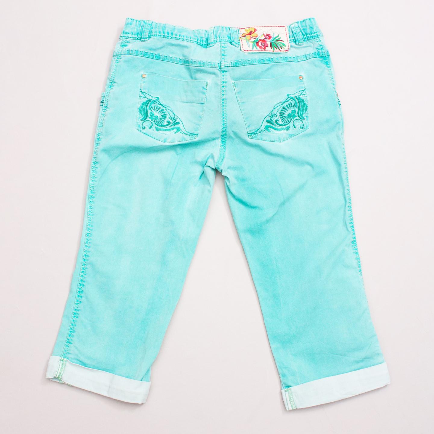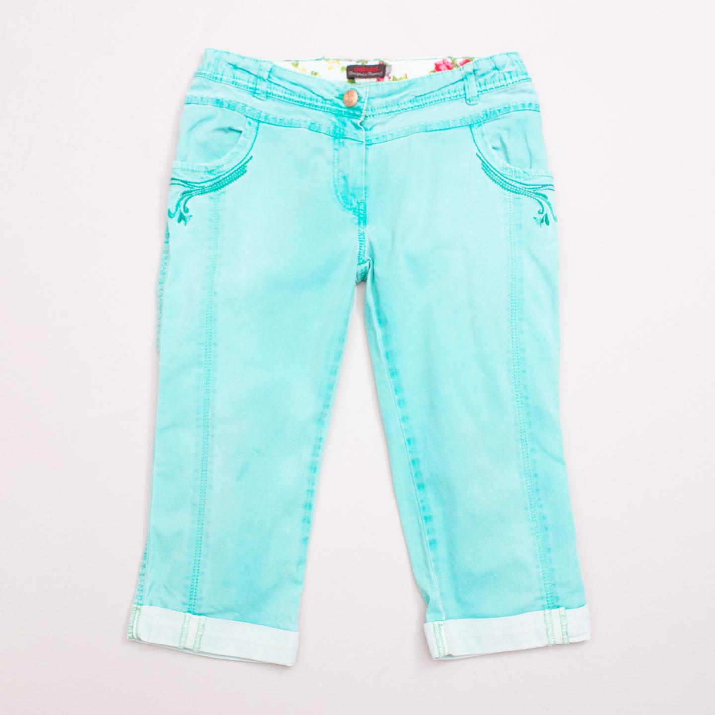 Catimini spearmint 3/4 pants with front and back pockets, embroidered details, rolled cuffs, belt loops and button/zip fastening