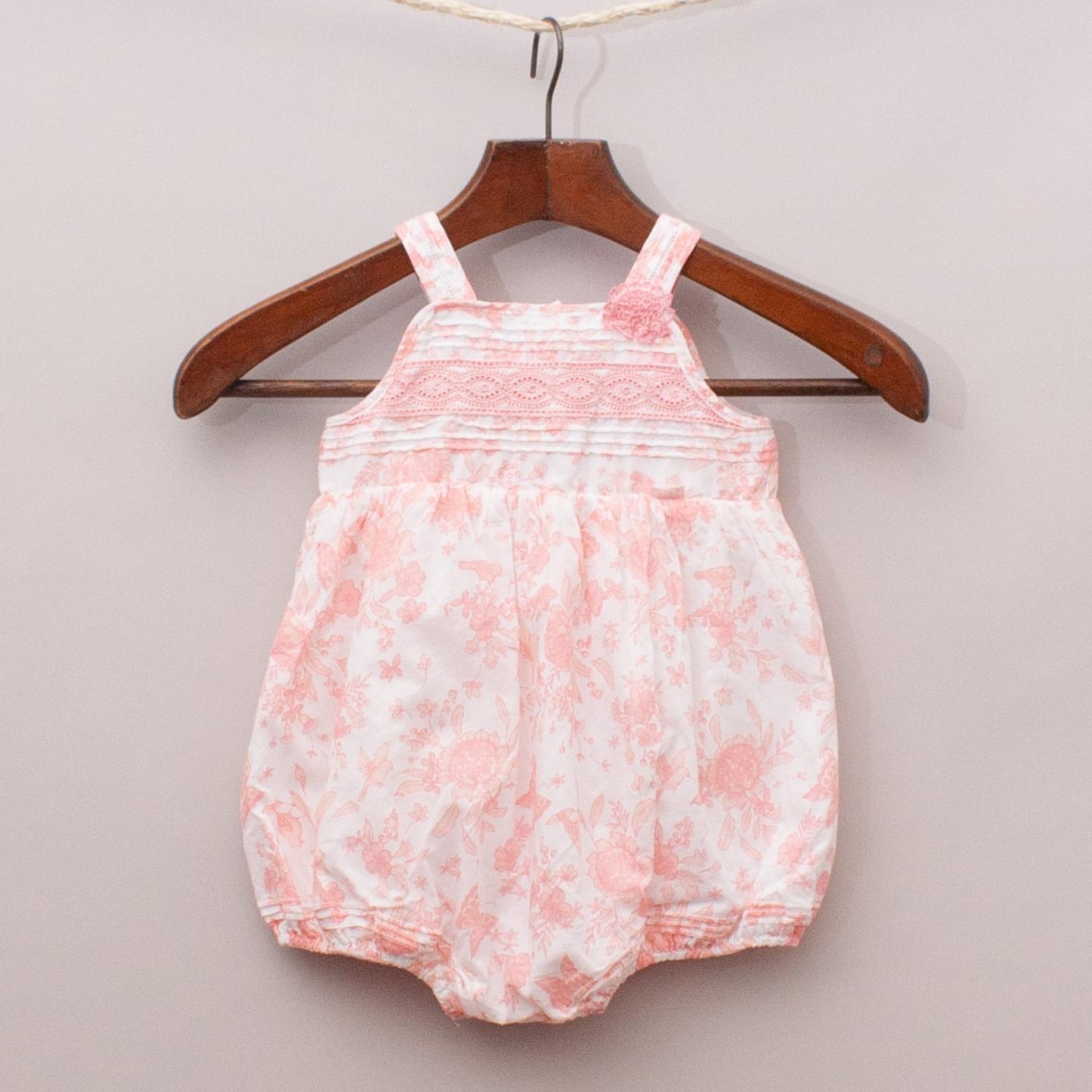 Catriona Rowntree pink and white floral patterned romper with pleating and lace details and button down back closure