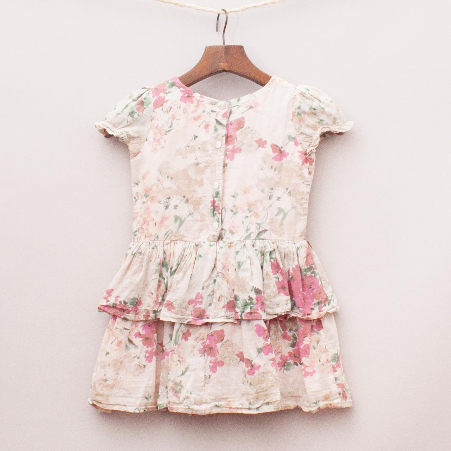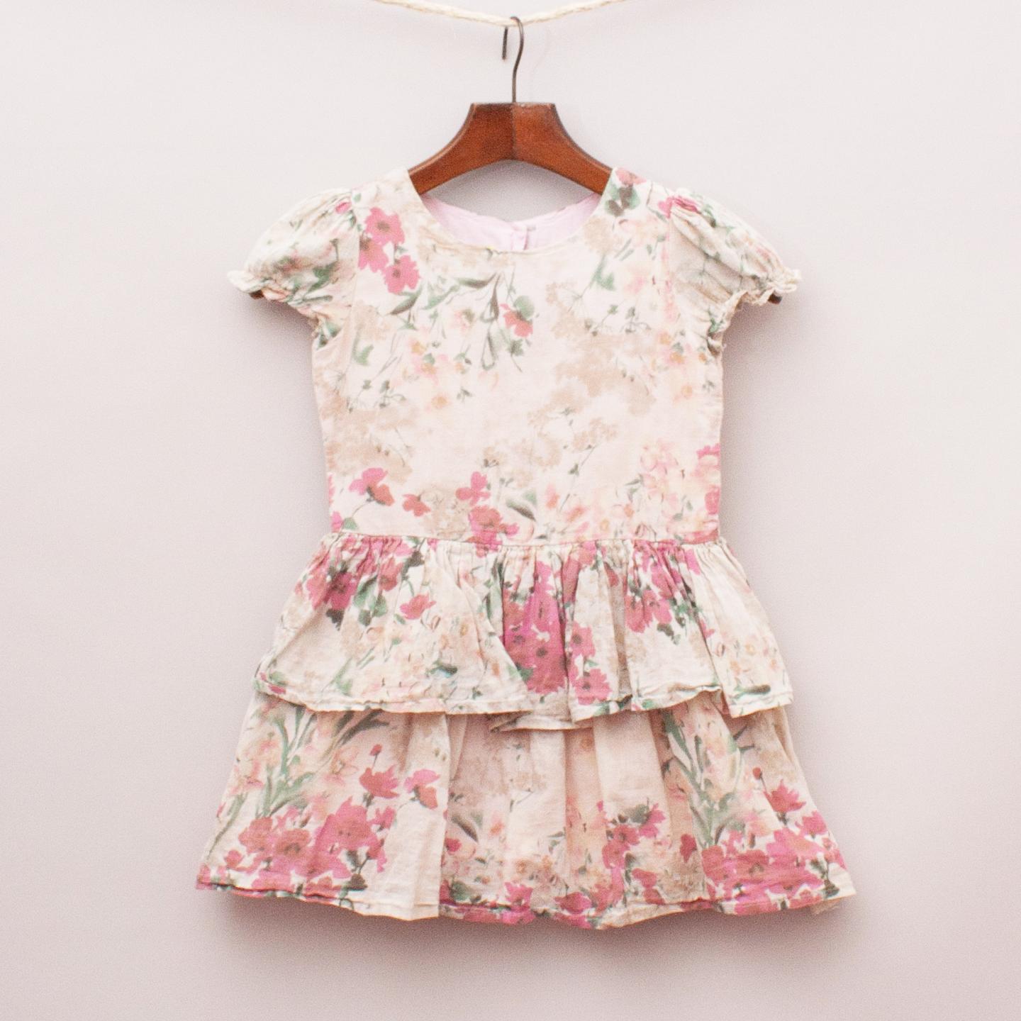 Chalk N Cheese pastel floral dress with puffed sleeves, ruffle, layered skirt, fully lined with button back closure