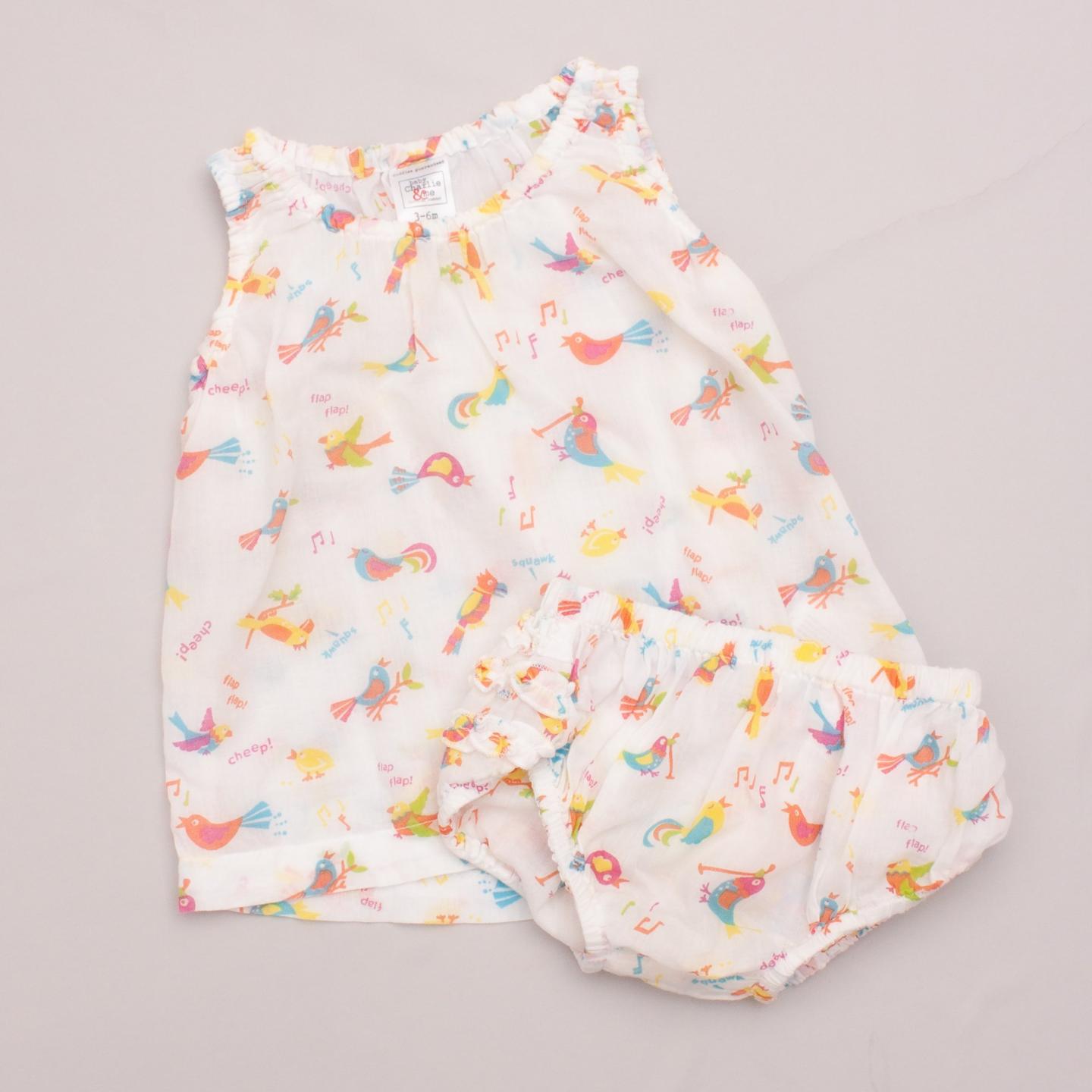 Charlie & Me white singlet top with bird print throughout, elastic sleeves and neckline with matching bloomers