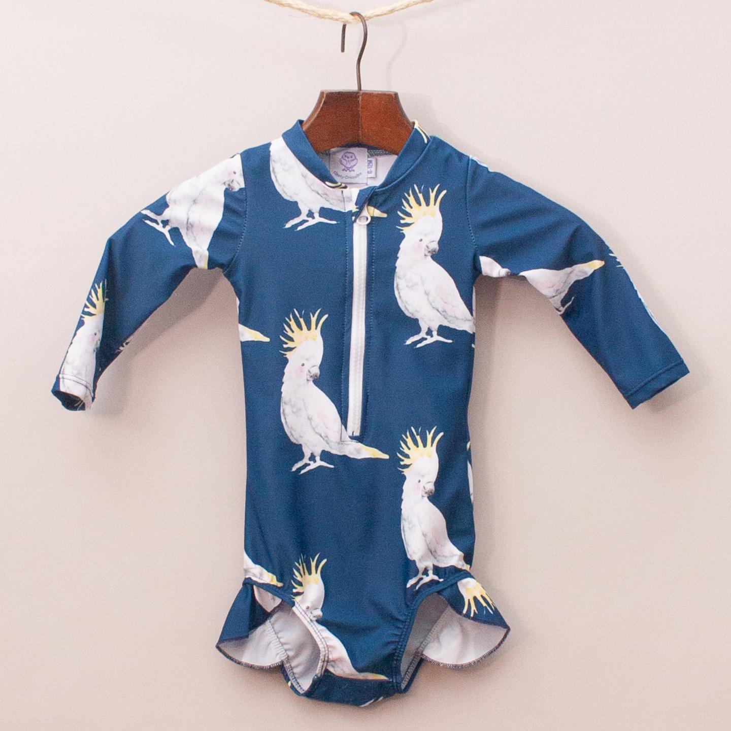 Cheeky Chickadee blue and cockatoo long sleeve bathers with ruffle details and zip up front