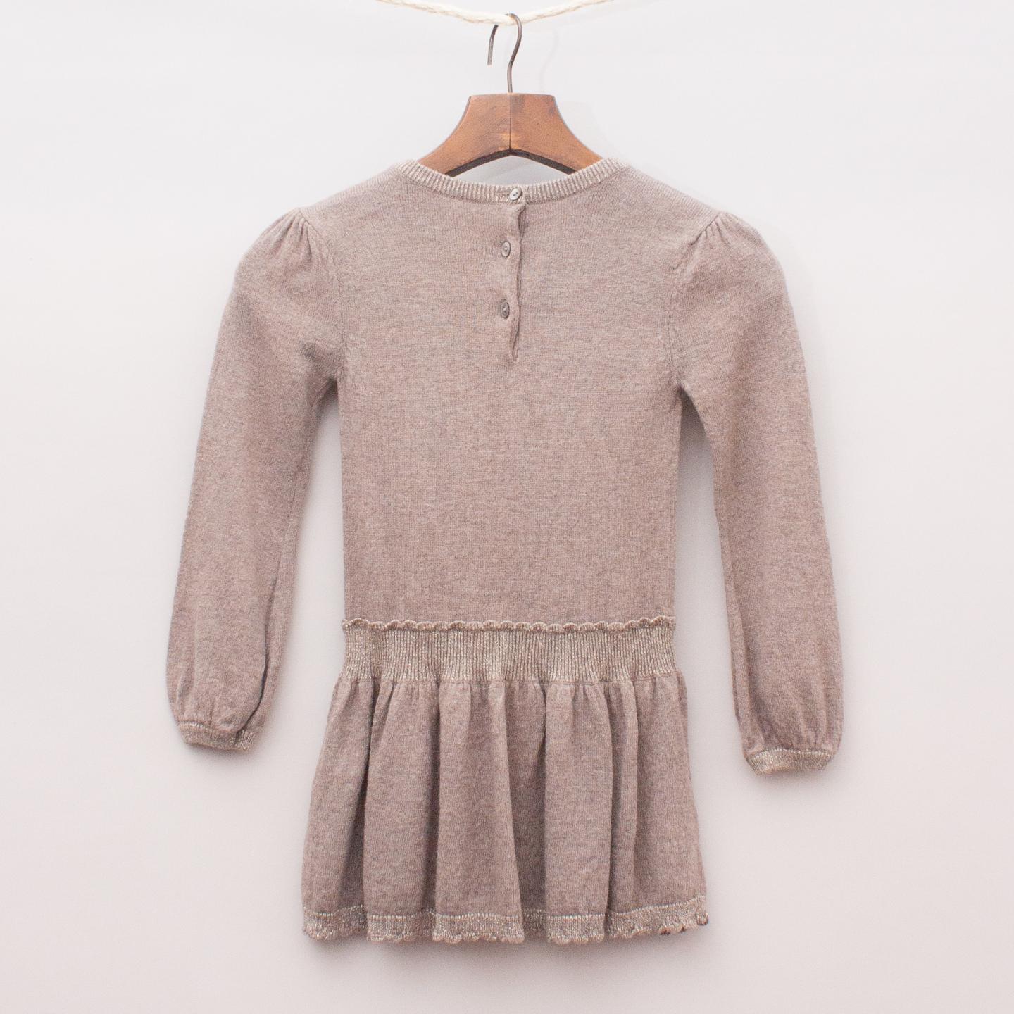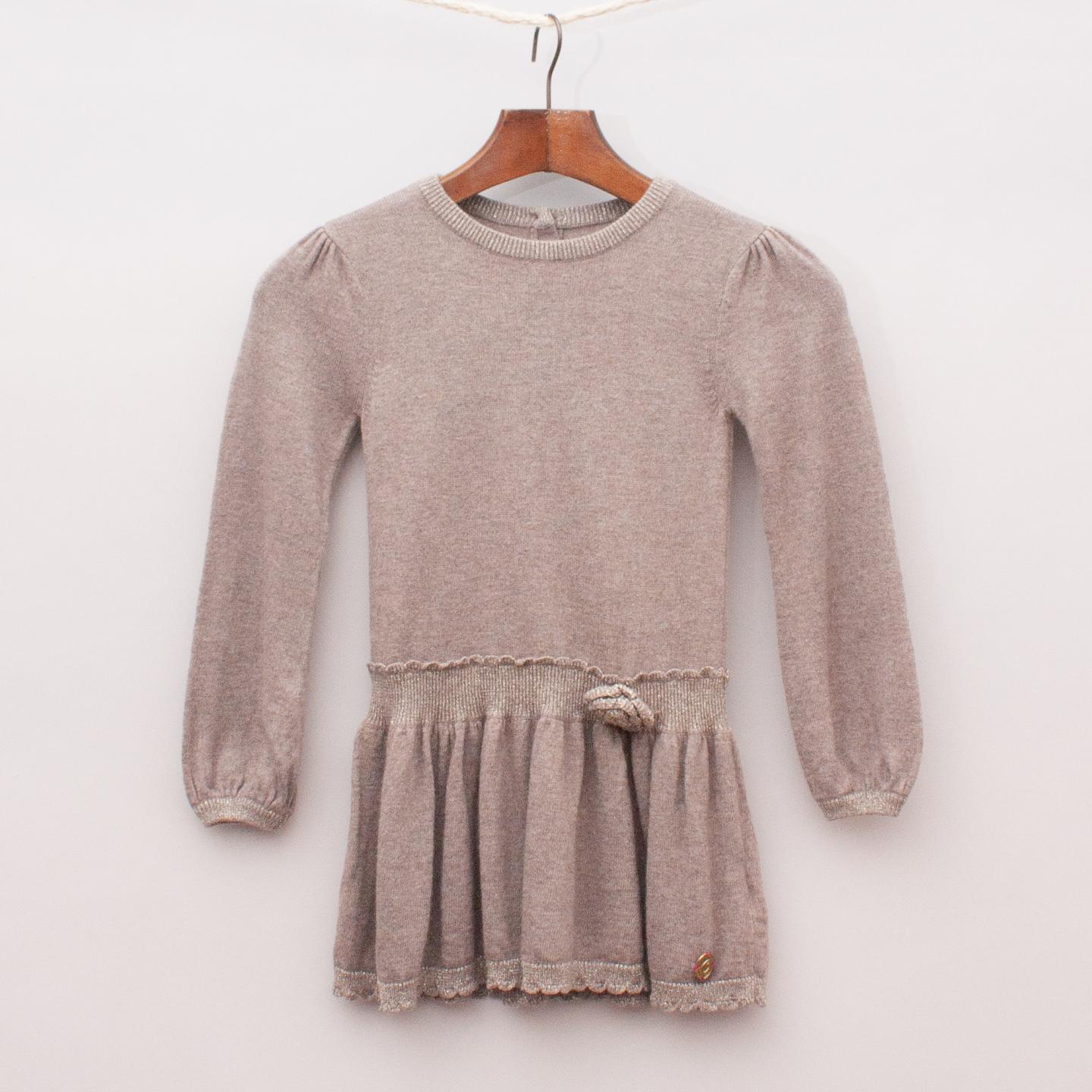 Chicco light brown woven long sleeve dress with gathered skirt, puffed shoulder detail, scalloped trim and metallic thread detailing throughout