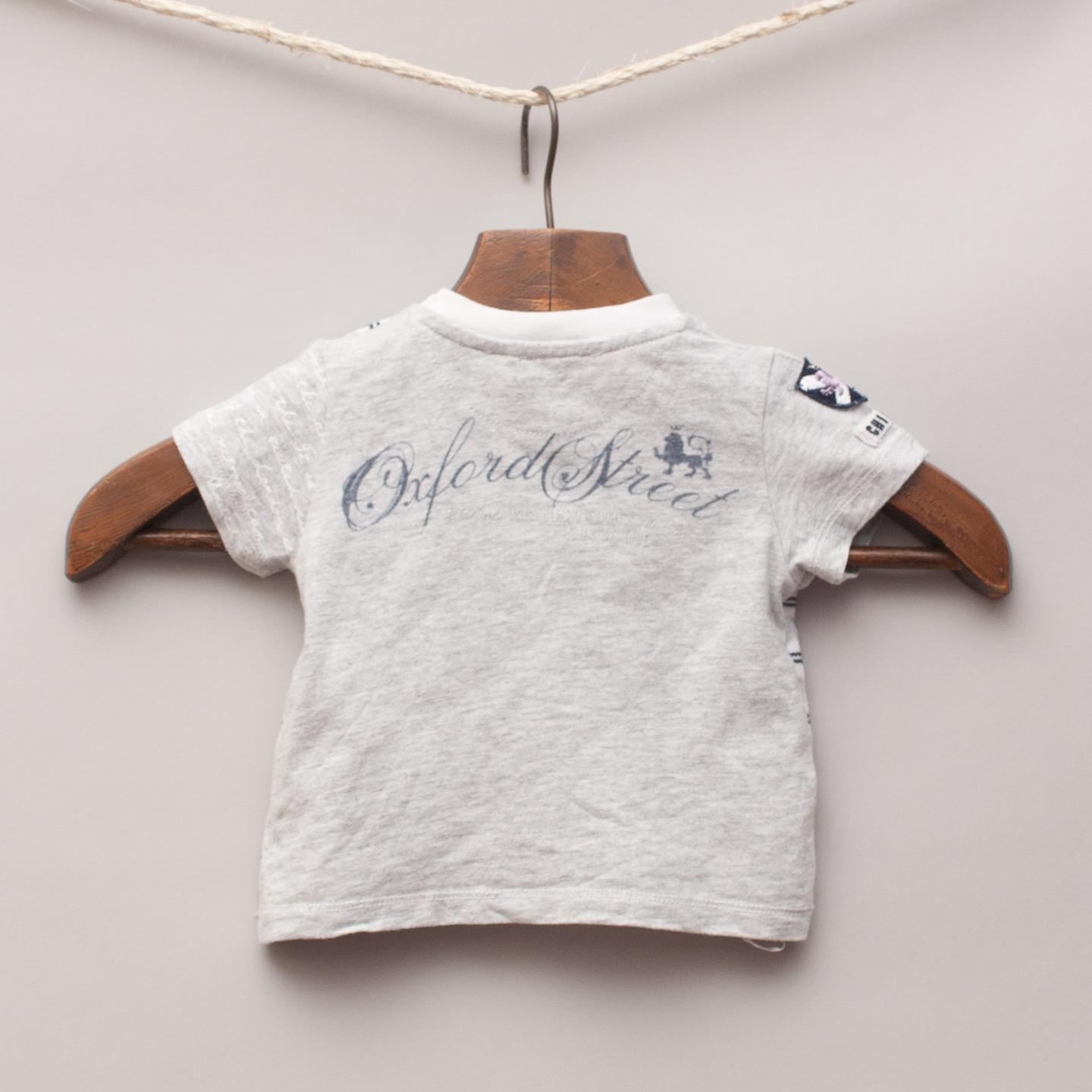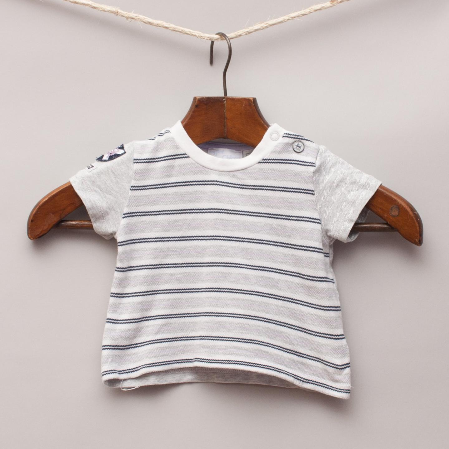 Chicco grey t-shirt with striped pattern on front, contrasting plain grey back with button and embroidery details