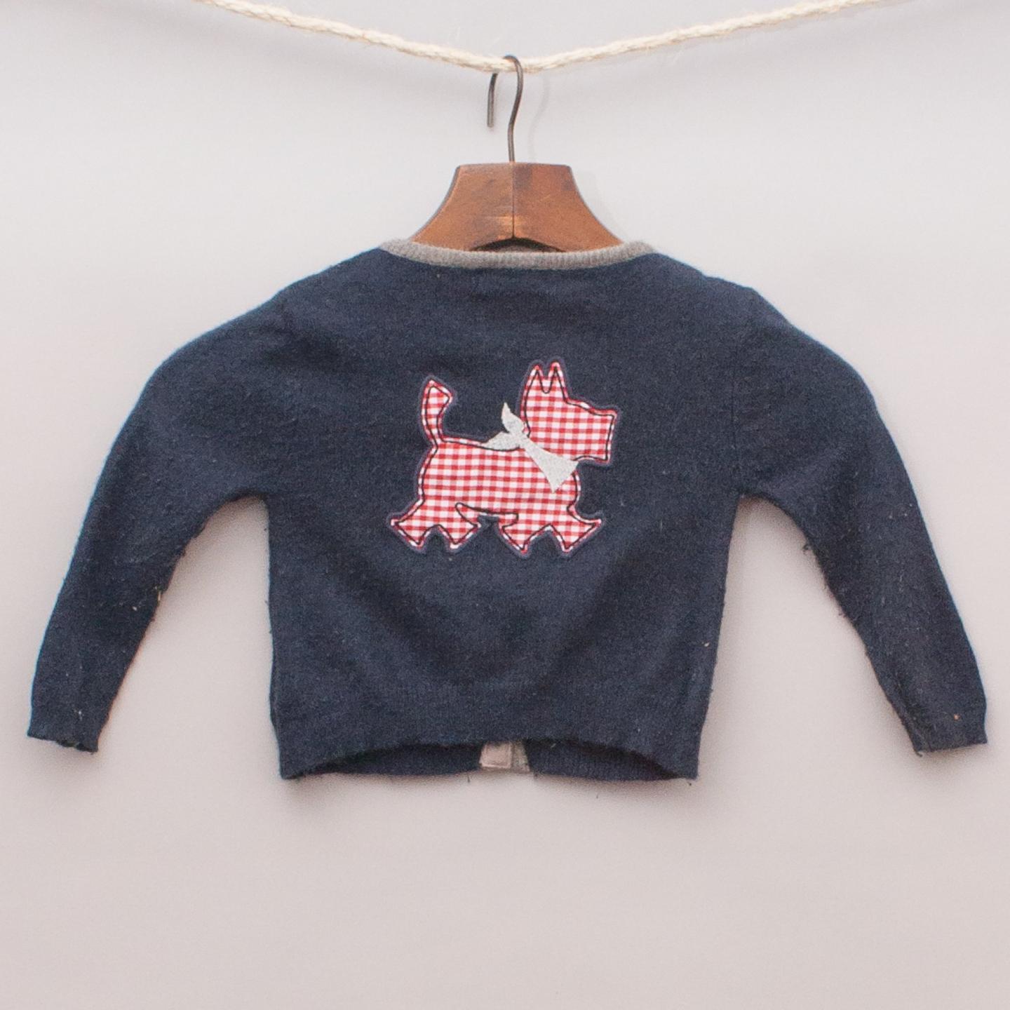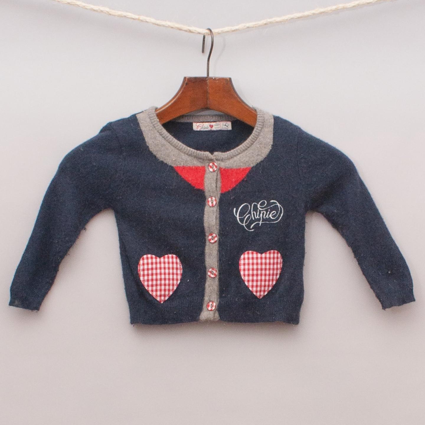 Chipie navy blue cardigan with heart shaped pockets, gingham features, embroidered logo and full button down front *Some pilling along the inside of the arms